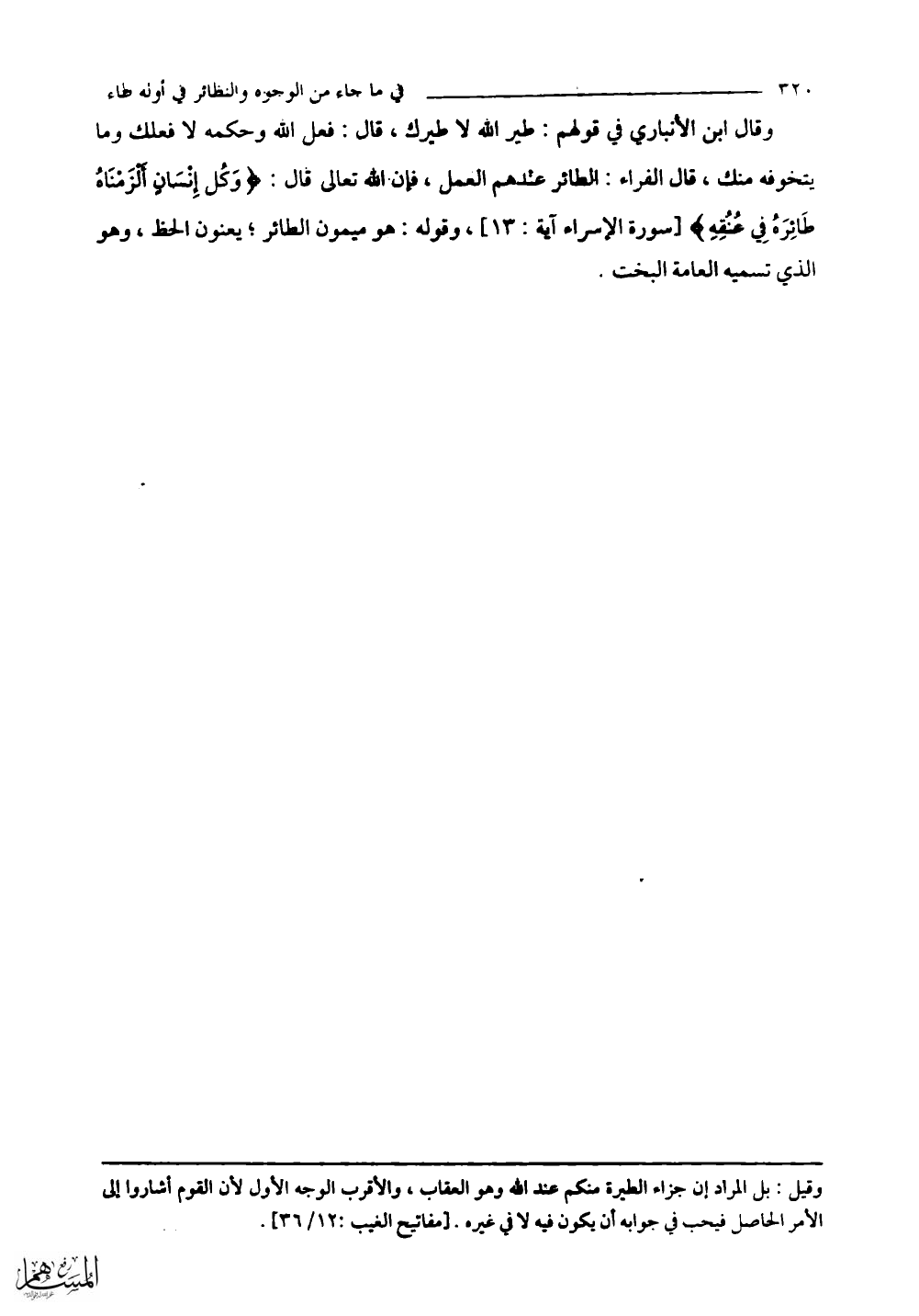 وقال ابن الأنباري في قولهم: طير اللَّه لا طيرك، قال: فعل الله وحكمه لا فعلك وما يتخوفه منك، قال الفراء: الطائر عندهم العمل، فإن اللَّه تعالى قال: (وَكُلَّ إِنْسَانٍ أَلْزَمْنَاهُ طَائِرَهُ فِي عُنُقِهِ) وقوله: هو ميمون الطائر؛ يعنون الحظ، وهو الذي تسميه العامة البخت.