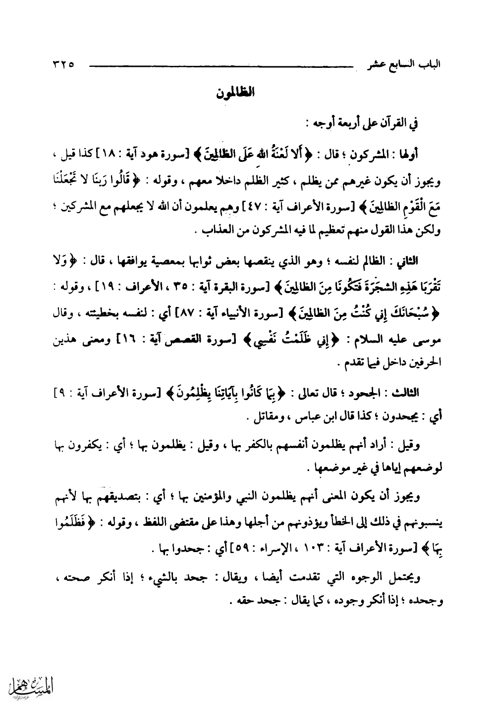 الثاني: الظالم لنفسه؛ وهو الذي يقصها بعض ثوابها بمعصية يوافقها، قال: (وَلَا تَقْرَبَا هَذِهِ الشَّجَرَةَ فَتَكُونَا مِنَ الظَّالِمِينَ) وقوله: (سُبْحَانَكَ إِنِّي كُنْتُ مِنَ الظَّالِمِينَ) أي: لنفسه بخطيئته، وقال موسى - عليه السلام -: (إِنِّي ظَلَمْتُ نَفْسِي) ومعنى هذين الحرفين داخل فيما تقدم.