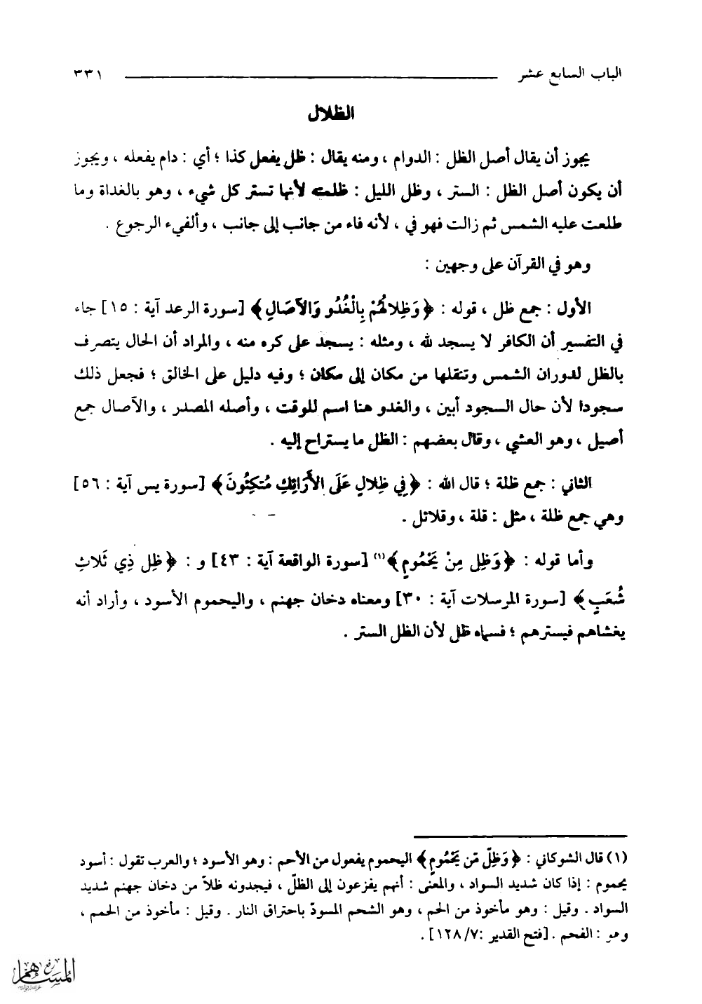 وأما قوله: (وَظِلٍّ مِنْ يَحْمُومٍ) و: (ظِلٍّ ذِي ثَلَاثِ شُعَبٍ) ومعناه دخان جهنم، واليحموم الأسود، وأراد أنه يغشاهم فيسترهم؛ فسماه ظل لأن الظل الستر.
