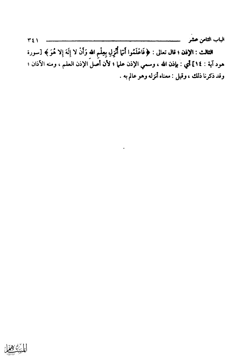 الثالث: الإذن قال تعالى: (فَاعْلَمُوا أَنَّمَا أُنْزِلَ بِعِلْمِ اللَّهِ وَأَنْ لَا إِلَهَ إِلَّا هُوَ) أي: بإذن اللَّهِ، وسُمِّي الإذن علما، لأن أصلَ الإذن العلم، ومنه الأذان؛ وقد ذكرنا ذلك، وقيل: معناه أنزله وهو عالم به.