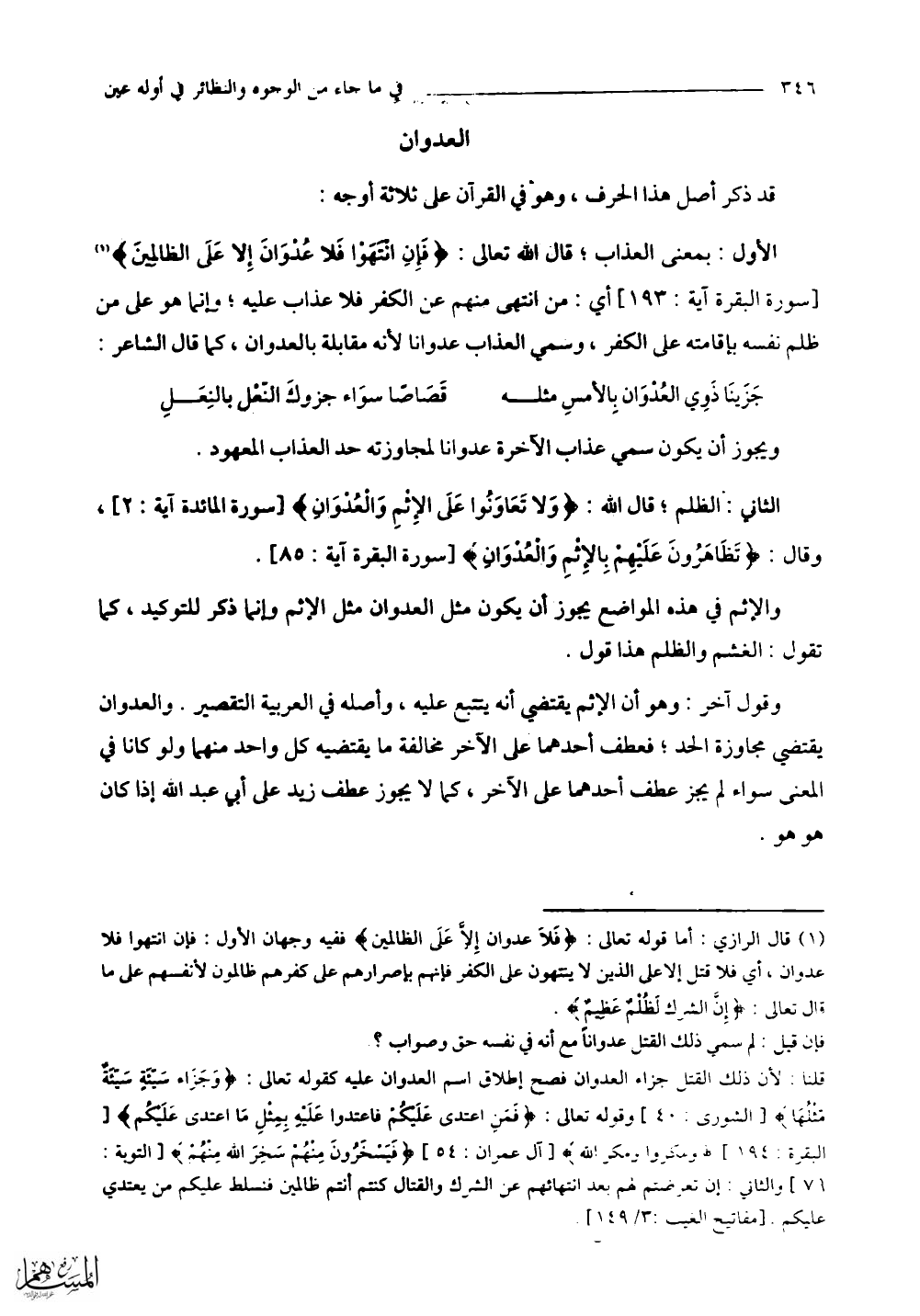 الأول: بمعنى العذاب؛ قال اللَّه تعالى: (فَإِنِ انْتَهَوْا فَلَا عُدْوَانَ إِلَّا عَلَى الظَّالِمِينَ) أي: من انتهى منهم عن الكفر فلا عذاب عليه؛ إنما هو على من ظلم نفسه بإقامته على الكفر، وسُمِّي العذاب عدوانا لأنه مقابلة بالعدوان، كما قال الشاعر: