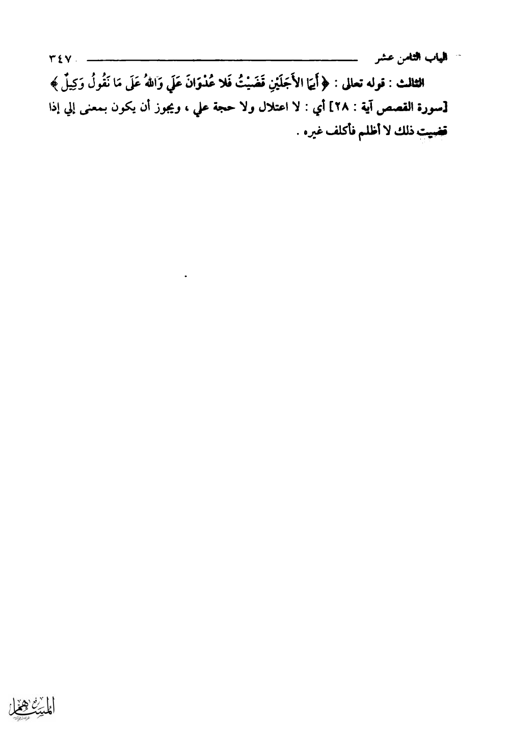 الثالث قوله تعالى: (أَيَّمَا الْأَجَلَيْنِ قَضَيْتُ فَلَا عُدْوَانَ عَلَيَّ وَاللَّهُ عَلَى مَا نَقُولُ وَكِيلٌ). أي: لا اعتلال ولا حجة عليَّ، ويجوز أن يكون بمعنى إلي إذا قضيت ذلك لا أظلم فأكلف غيره.
