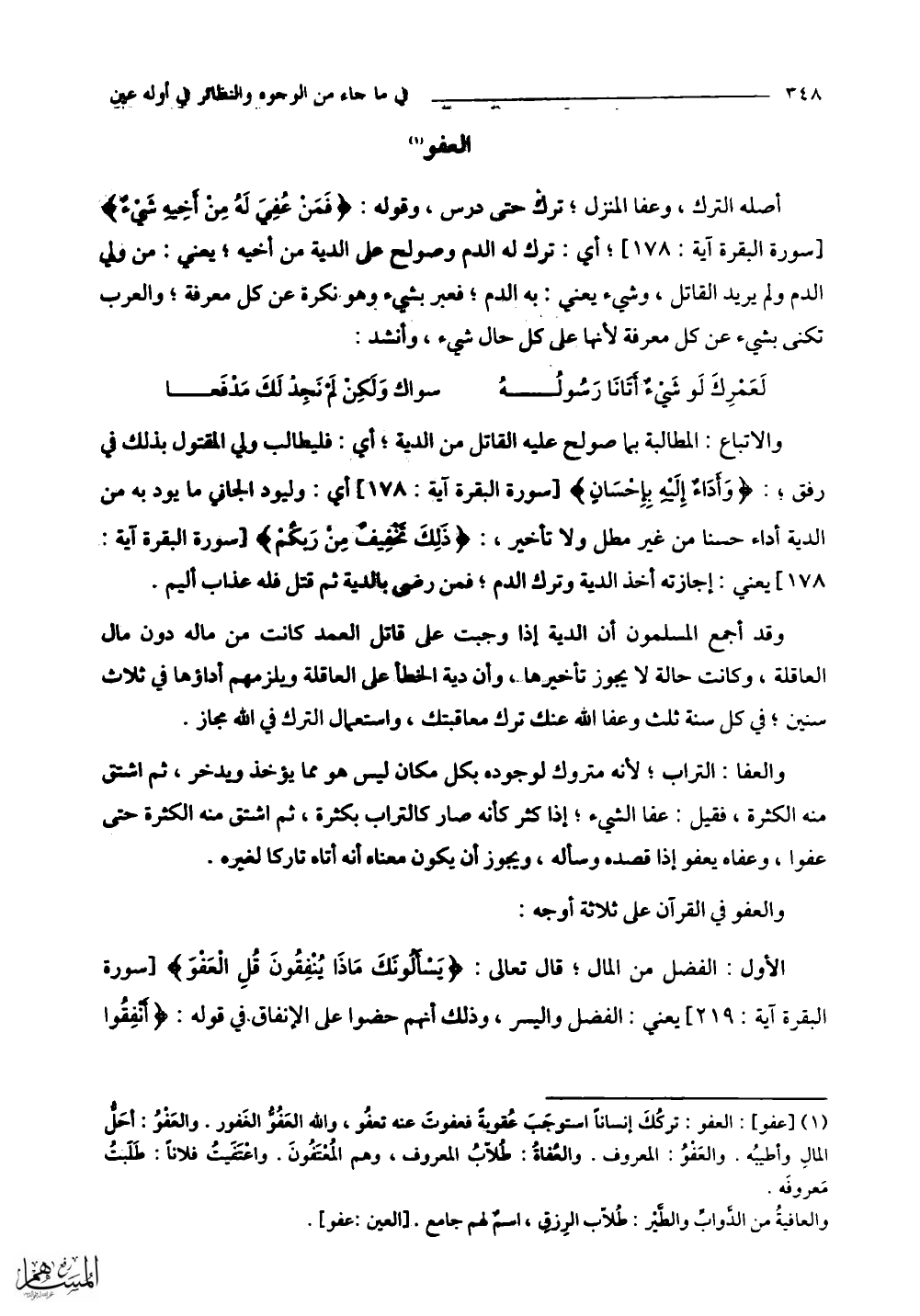 والعفا: التراب؛ لأنه متروك لوجوده بكل مكان ليس هو مما يؤخذ ويدخر، ثم اشتق منه الكثرة، فقيل: عفا الشيء؛ إذا كثر كأنَّه صار كالتراب بكثرة، ثم اشتق منه الكثرة حتى عفوا، وعفاه يعفو إذا قصده وسأله، ويجوز أن يكون معناه أنه أتاه تاركا لغيره. والعفو في القرآن على ثلاثة أوجه: