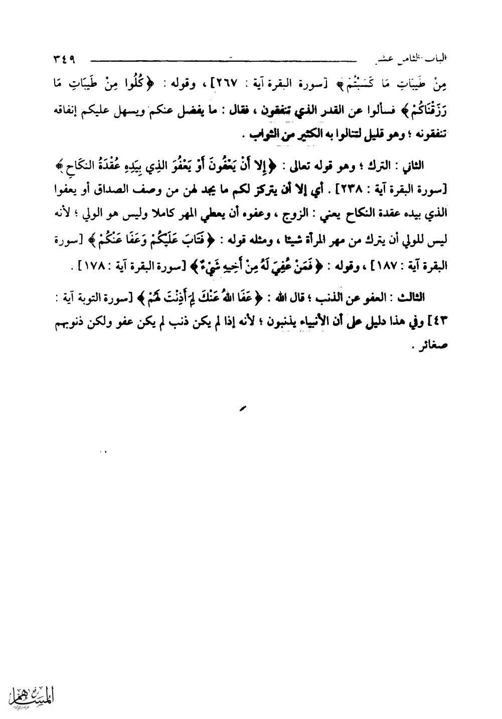 الثاني: الترك؛ وهو قوله تعالى: (إِلَّا أَنْ يَعْفُونَ أَوْ يَعْفُوَ الَّذِي بِيَدِهِ عُقْدَةُ النِّكَاحِ) أي إلا أن [يتركن لكم ما يجب] لهن من [نصف] الصداق أو يعفوا الذي بيده عقدة النكاح يعني: الزوج، وعفوه أن يعطي المهر كاملا وليس هو الولي؛ لأنه ليس للولي أن يترك من مهر المرأة شيئا، ومثله قوله: (فَتَابَ عَلَيْكُمْ وَعَفَا عَنْكُمْ) وقوله: (فَمَنْ عُفِيَ لَهُ مِنْ أَخِيهِ شَيْءٌ).