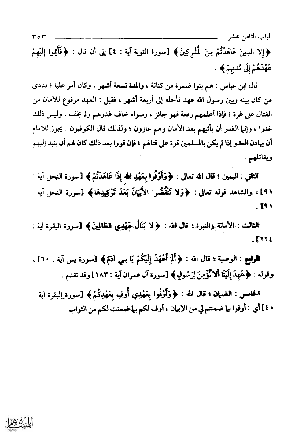 الخامس: الضمان؛ قال الله: (وَأَوْفُوا بِعَهْدِي أُوفِ بِعَهْدِكُمْ) أي: أوفوا بما ضمنتم لي من الإيمان، أوف لكم بما ضمنت لكم من الثواب.