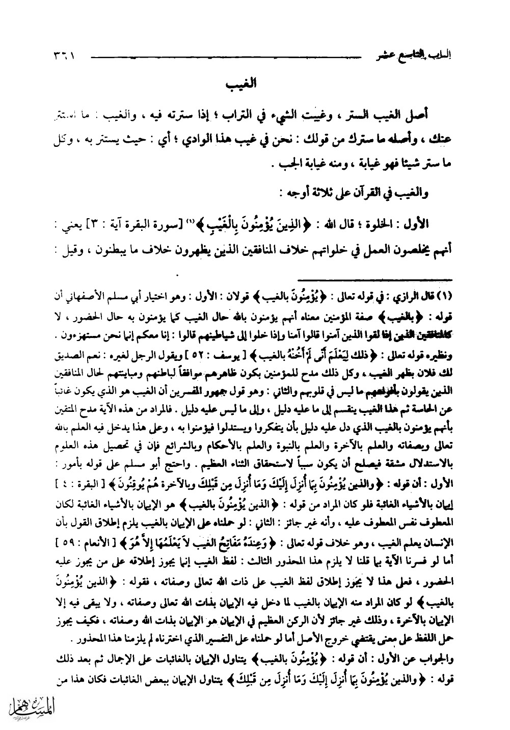 الأول: الخلوة؛ قال اللَّه: (الَّذِينَ يُؤْمِنُونَ بِالْغَيْبِ) يعني: أنهم يخلصون العمل في خلواتهم خلاف المنافقين الذين يظهرون خلاف ما يبطون، وقيل: