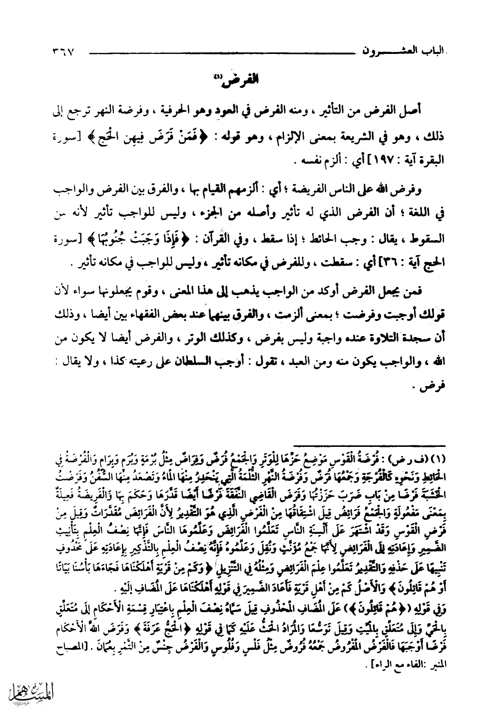 أصل الفرض من التأثير، ومنه الفرض في العود وهو الحرفية، وفرضة النهر ترجع إلى ذلك، وهو في الشريعة بمعنى الإلزام، وهو قوله: (فَمَنْ فَرَضَ فِيهِنَّ الْحَجَّ) أي: ألزم نفسه.