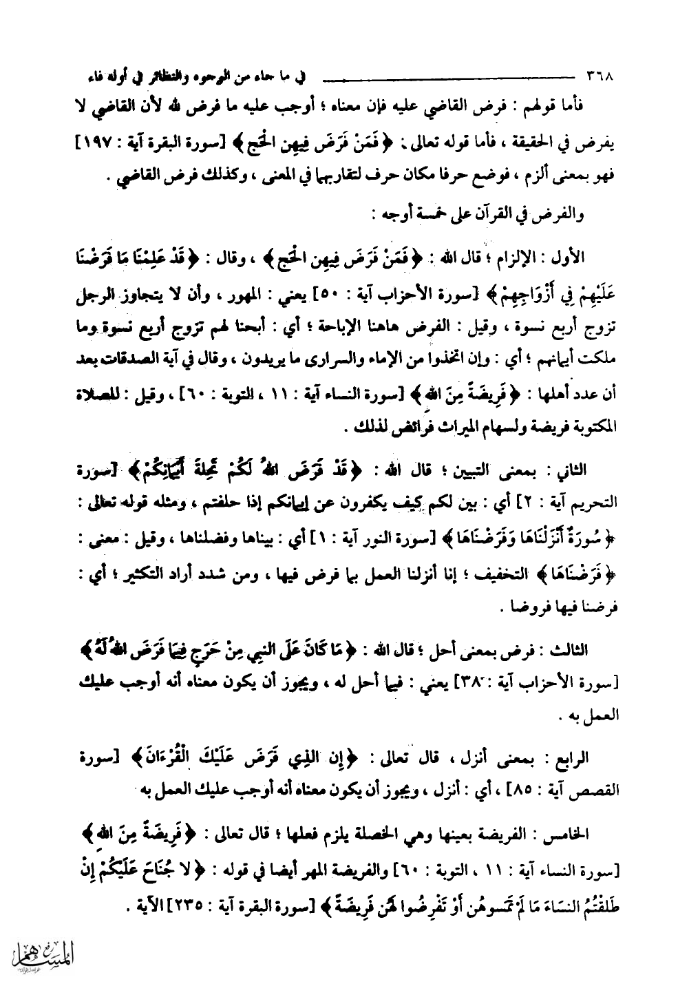 الخامس: الفريضة بعينها وهي الخصلة يلزم فعلها، قال تعالى: (فَرِيضَةً مِنَ اللَّهِ) والفريضة المهر أصله قوله: (لَا جُنَاحَ عَلَيْكُمْ إِنْ طَلَّقْتُمُ النِّسَاءَ مَا لَمْ تَمَسُّوهُنَّ أَوْ تَفْرِضُوا لَهُنَّ فَرِيضَةً).