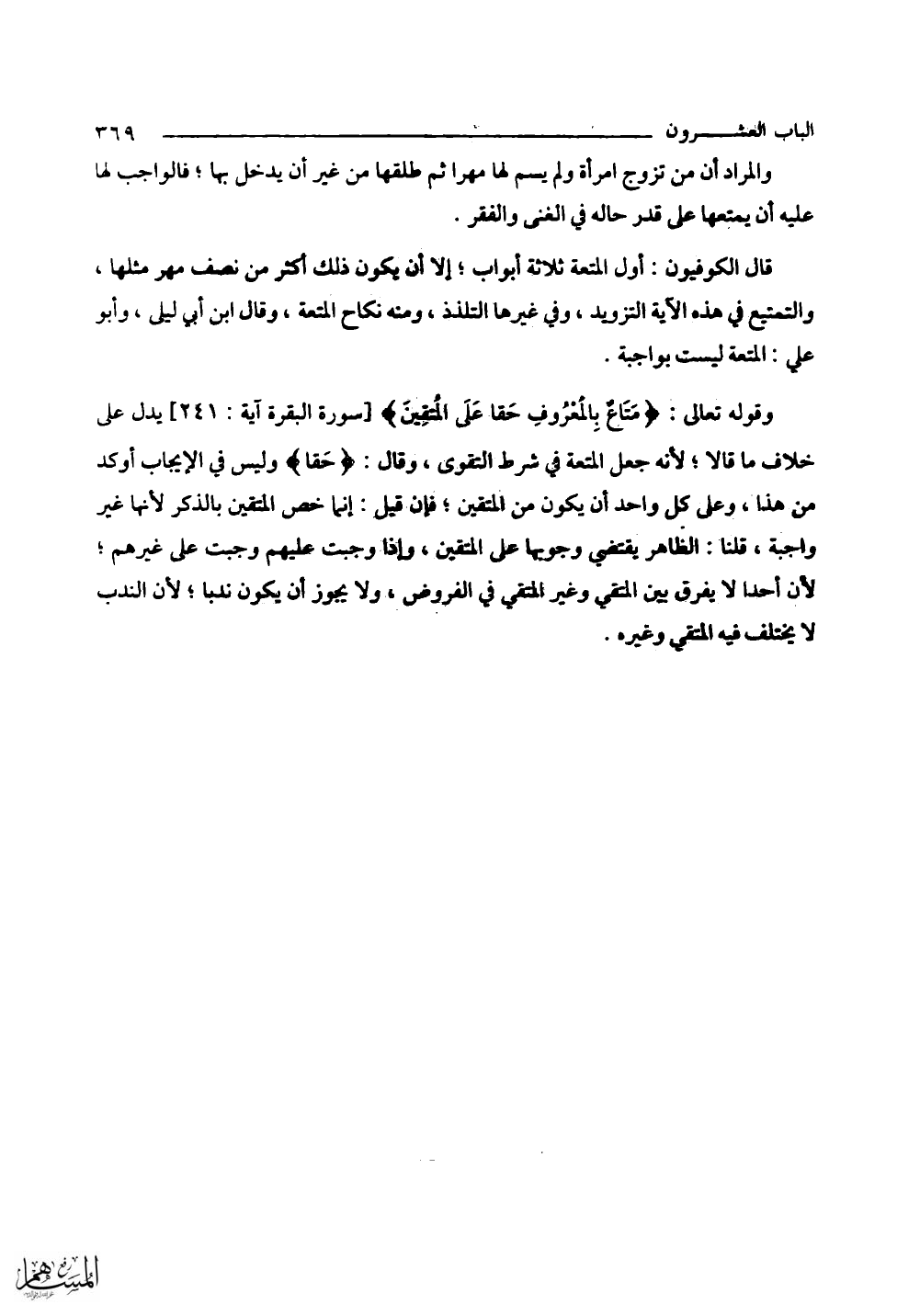 وقوله تعالى: (مَتَاعٌ بِالْمَعْرُوفِ حَقًّا عَلَى الْمُتَّقِينَ) يدل على خلاف ما قالا؛ لأنه جعل المتعة في شرط التقوى، وقال: (حَقًّا) وليس في الإيجاب أوكد من هذا، وعلى كل واحد أن يكون من المتقين؛ فإن قيل: إنما خص المتقين بالذكر لأنها غير واجبة، قلنا: الظاهر يقتضي وجوبها على المتقين، وإذا وجبت عليهم وجبت على غيرهم، لأن أحدا لا يفرق بين المتقي وغير المتقي في الفروض، ولا يجوز أن يكون ندبا؛ لأن الندب لا يختلف فيه المتقي وغيره.