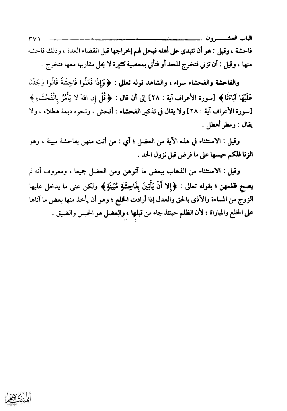 وقيل: الاستثناء من الذهاب ببعض ما آتوهن ومن العضل جميعا، ومعروف أنه لم يصح ظلمهن؛ بقوله تعالى: (إِلَّا أَنْ يَأْتِينَ بِفَاحِشَةٍ مُبَيِّنَةٍ) ولكن عنى ما يدخل عليها الزوج من المساءة والأذى بالحق والعدل إذا أرادت الخلع؛ وهو أن يأخذ منها بعض ما آتاها على الخلع والمباراة؛ لأن الظلم حينئذ جاء من قبلها، والعضل هو الحبس والضيق.