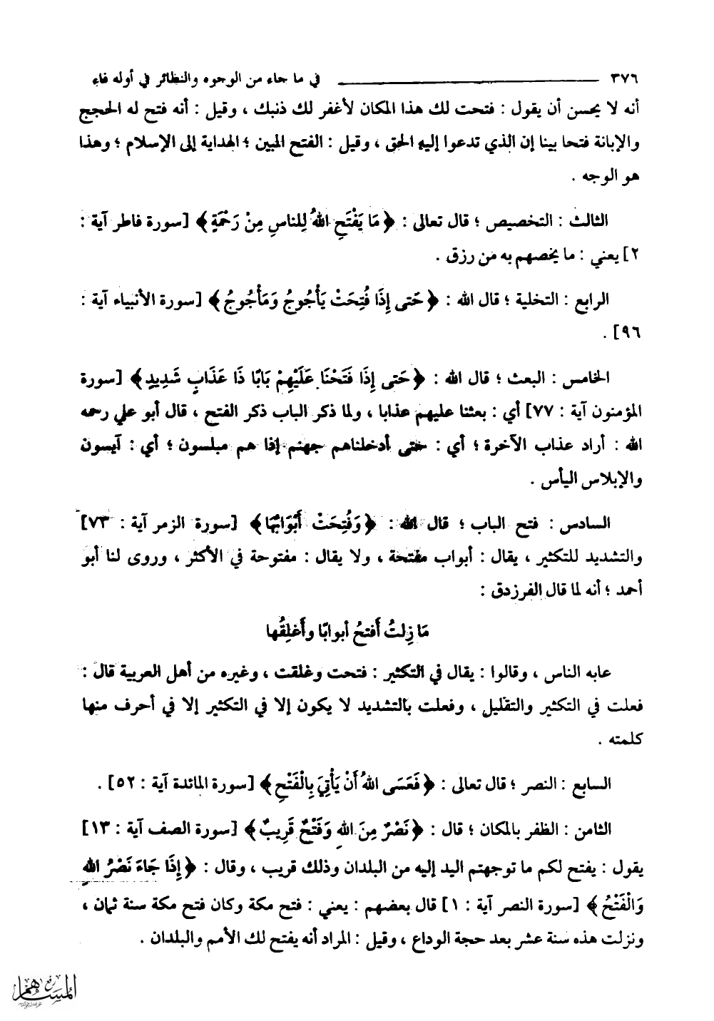 الثامن: الظفر بالمكان؛ قال: (نَصْرٌ مِنَ اللَّهِ وَفَتْحٌ قَرِيبٌ) يقول: يفتح لكم ما توجهتم اليد إليه من البلدان وذلك قريب، وقال: (إِذَا جَاءَ نَصْرُ اللَّهِ وَالْفَتْحُ) قال بعضهم؛ يعني: فتح مكة وكان فتح مكة سنة ثمان، ونزلت هذه سنة عشر بعد حجة الوداع، وقيل: المراد أنه يفتح لك الأمم والبلدان.
