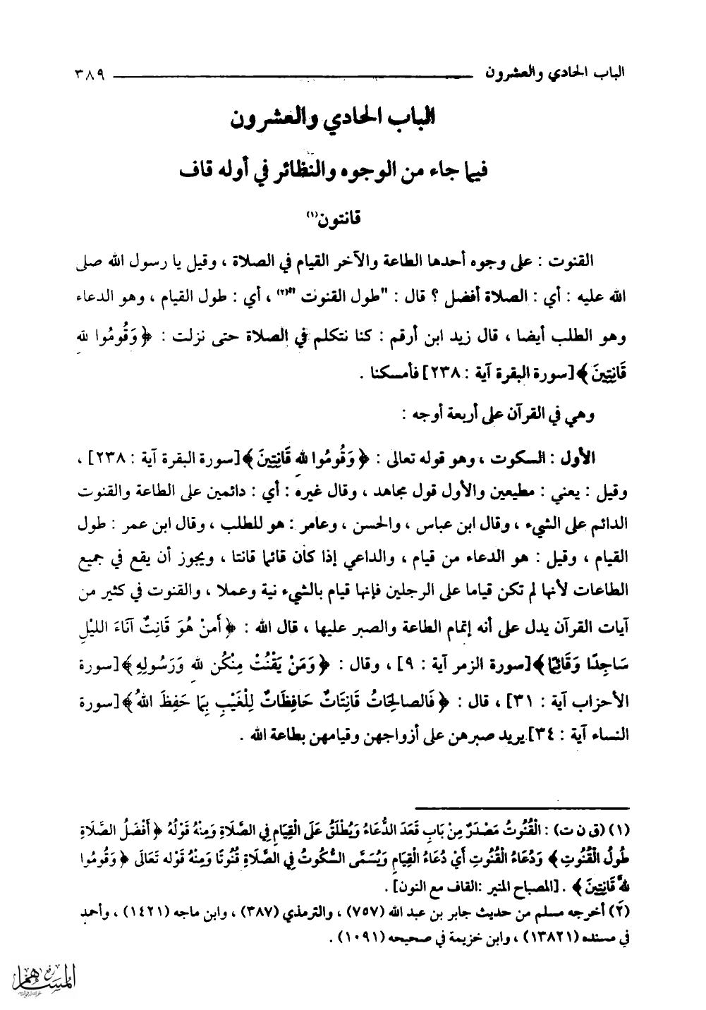 الأول: السكوت، وهو قوله تعالى: (وَقُومُوا لِلَّهِ قَانِتِينَ) وقيل: يعني: مطيعين والأول قول مجاهد، وقال غيره: أي: دائمين على الطاعة والقنوت الدائم على الشيء، وقال ابن عباس، والحسن، وعامر: هو للطلب، وقال ابن عمر: طول القيام، وقيل: هو الدعاء من قيام، والداعي إذا كان قائما قانتا، ويجوز أن يقع في جميع الطاعات لأنَّهَا لم تكن قياما على الرجلين فإنها قيام بالشيء نية وعملا، والقنوت في كثير من آيات القرآن يدل على أنه إتمام الطاعة والصبر عليها، قال الله: (أَمَّنْ هُوَ قَانِتٌ آنَاءَ اللَّيْلِ سَاجِدًا وَقَائِمًا) وقال: (وَمَنْ يَقْنُتْ مِنْكُنَّ لِلَّهِ وَرَسُولِهِ) قال: (فَالصَّالِحَاتُ قَانِتَاتٌ حَافِظَاتٌ لِلْغَيْبِ بِمَا حَفِظَ اللَّهُ) يريد صبرهن على أزواجهن وقيامهن بطاعة الله.