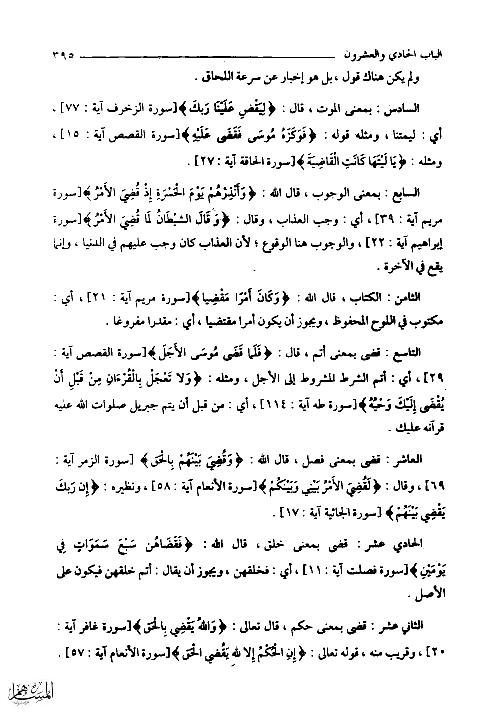 السابع: بمعنى الوجوب، قال الله: (وَأَنْذِرْهُمْ يَوْمَ الْحَسْرَةِ إِذْ قُضِيَ الْأَمْرُ) أي: وجب العذاب، وقال: (وَقَالَ الشَّيْطَانُ لَمَّا قُضِيَ الْأَمْرُ) والوجوب هنا الوقوع؛ لأن العذاب كان وجب عليهم في الدنيا، وإنما يقع في الآخرة.