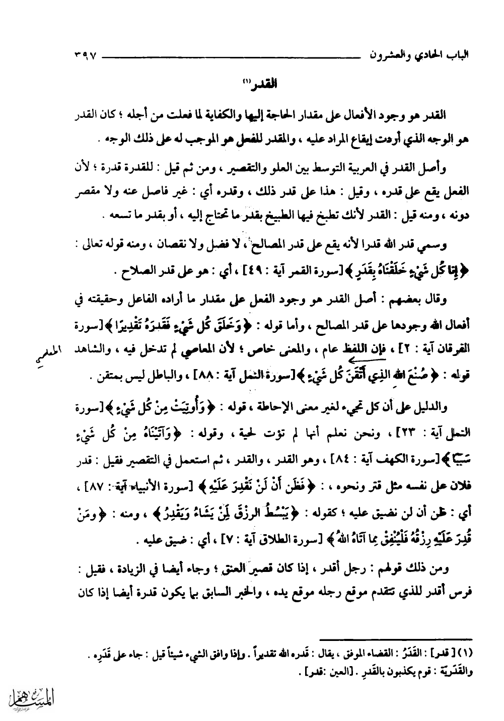 القدر هو وجود الأفعال على مقدار الحاجة إليها والكفاية لما فعلت من أجله؛ كان القدر هو الوجه الذي أردت إيقاع المراد عليه، والمقدر للفعل هو الموجب له على ذلك الوجه.