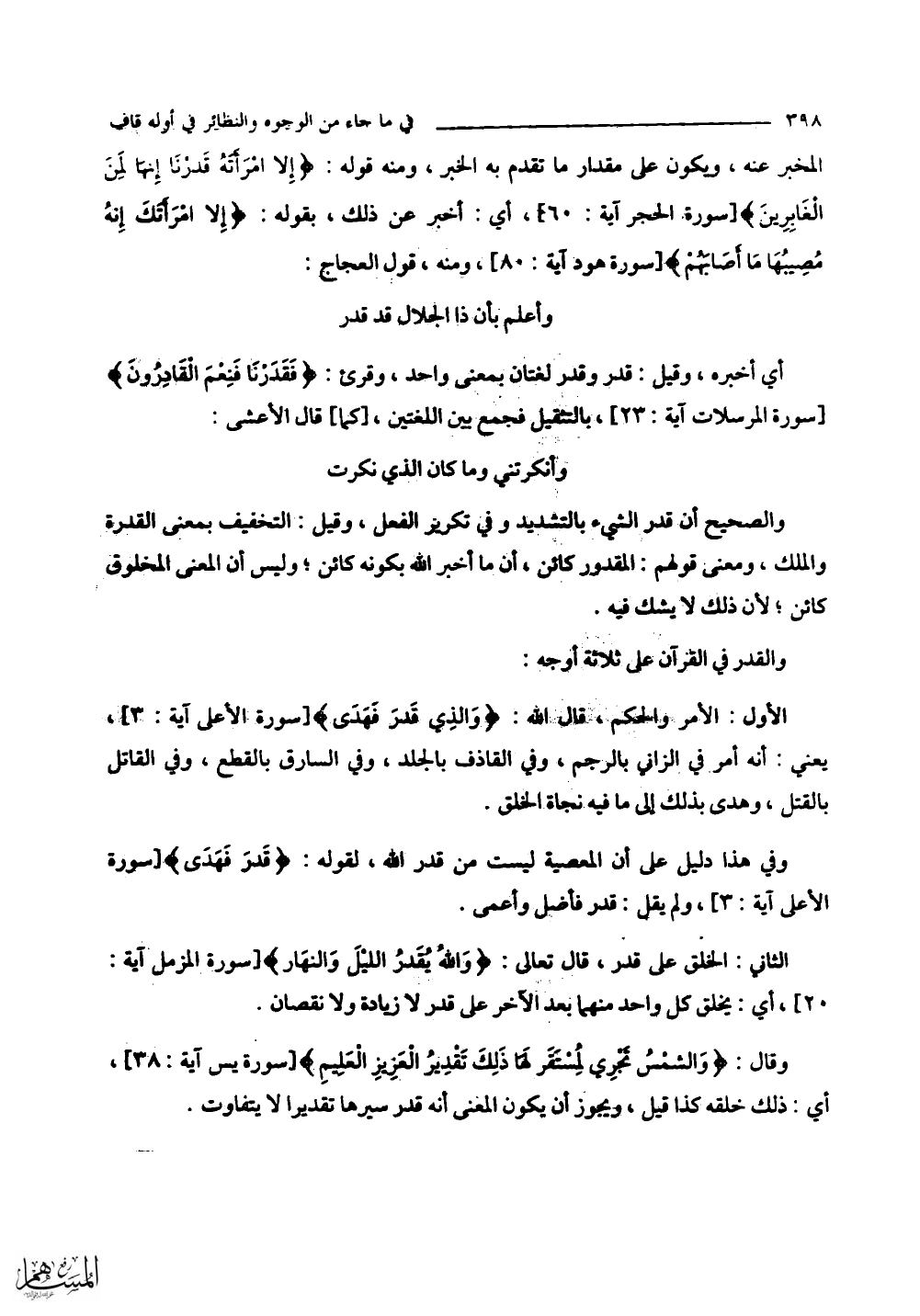 والصحيح أن قدَّر الشيء بالتشديد وفي تكرير الفعل، وقيل: التخيف بمعنى القدر والملك، ومعنى قولهم: المقدور كائن، أن ما أخبر اللَّه بكونه كائن؛ وليس أن المعنى المخلوق كائن؛ لأن ذلك لا يشك فيه.