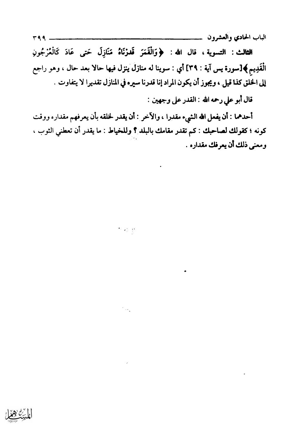 الثالث: التسوية، قال اللَّه: (وَالْقَمَرَ قَدَّرْنَاهُ مَنَازِلَ حَتَّى عَادَ كَالْعُرْجُونِ الْقَدِيمِ) أي: سوينا له منازل ينزل فيها حالا بعد حال، وهو راجع إلى الخلق كذا قيل، ويجوز أن يكون المراد إنا قدرنا سيره في المنازل تقديرا لا يتفاوت.