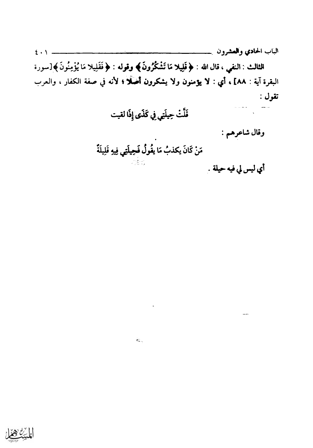 الثالث: النفي، قال الله: (قَلِيلًا مَا تَشْكُرُونَ) وقوله: (فَقَلِيلًا مَا يُؤْمِنُونَ) أي: لا يؤمنون ولا يشكرون أصلا، لأنه في صفة الكفار، والعرب تقول: