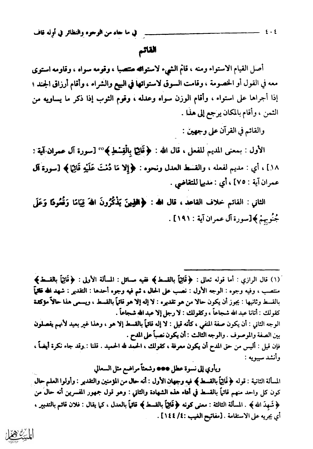 الأول: بمعنى المديم للفعل، قال اللَّه: (قَائِمًا بِالْقِسْطِ) أي: مديم لفعله، والقسط العدل ونحوه: (إِلَّا مَا دُمْتَ عَلَيْهِ قَائِمًا) أي: مديما للتقاضي.