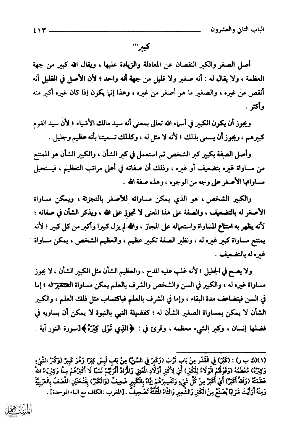 والكبير الشخض، هو الذي يمكن مساواته للأصغر بالتجزئة، ويمكن مساواة الأصغر له بالتضعيف، والصفة على هذا المعنى لا تجوز على اللَّه، ويذكر الشأن في صفاته؛ لأنه يظهر به امتناع المساواة واستعماله على المجاز، والله لم يزل كبيرا وأكبر من كل كبير؛ لأنه يمتنع مساواة كبير غيره له، ونظير الصفة تكبير عظيم، والعظيم الشخص، يمكن مساواة غيره له بالتضعيف.