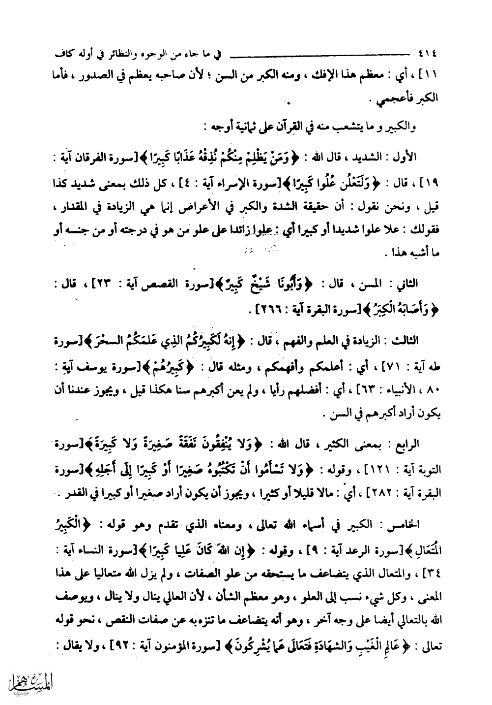 والكبير وما يتشعب منه في القرآن على ثمانية أوجه: