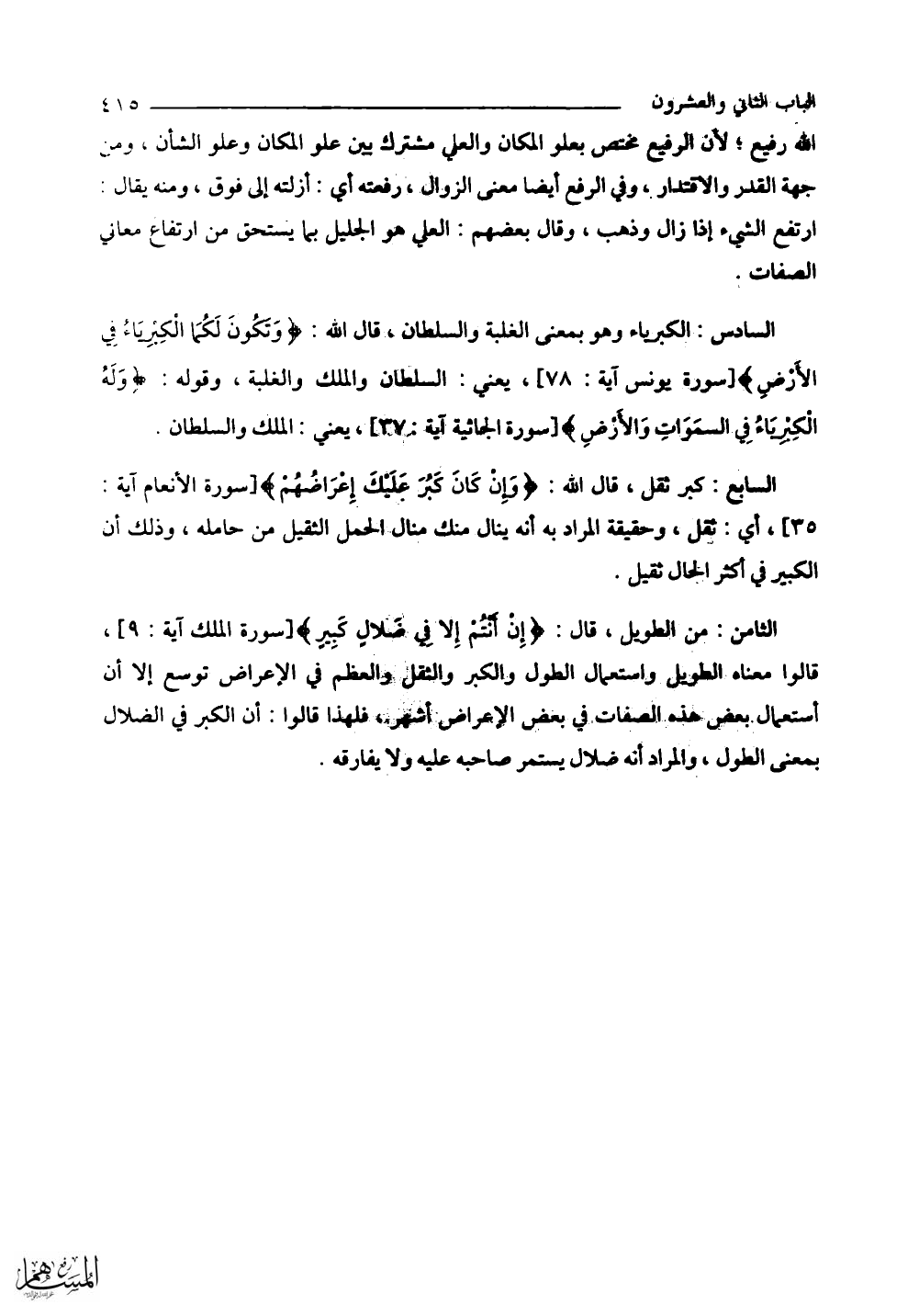 الثامن: من الطويل، قال: (إِنْ أَنْتُمْ إِلَّا فِي ضَلَالٍ كَبِيرٍ) قالوا معناه الطويل واستعمال الطول والكبر والثقل والعظم في الأعراض توسع إلا أن استعمال بعض هذه الصفات في بعض الأعراض أشهر، فلهذا قالوا: إن الكبر في الضلال بمعنى الطول، والمراد أنه ضلال يستمر صاحبه عليه ولا يفارقه.