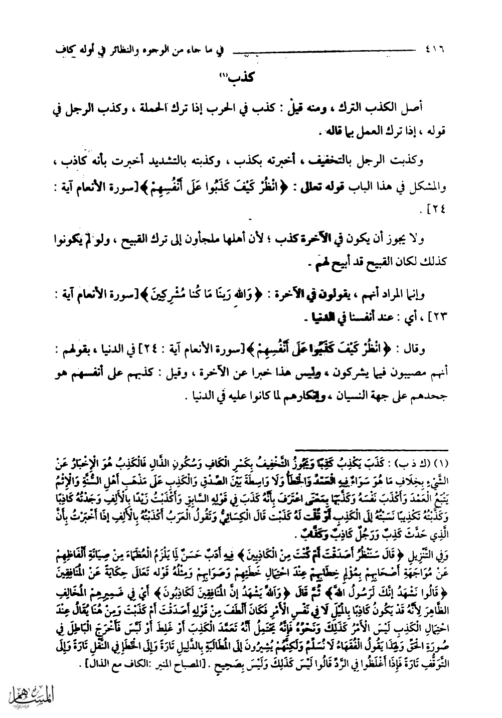 وكذَّبت الرجل بالتخفيف، أخبرته بكذب، وكذَّبته بالتشديد أخبرت بأنه كاذب، والمشكل في هذا الباب قوله تعالى: (انْظُرْ كَيْفَ كَذَبُوا عَلَى أَنْفُسِهِمْ).