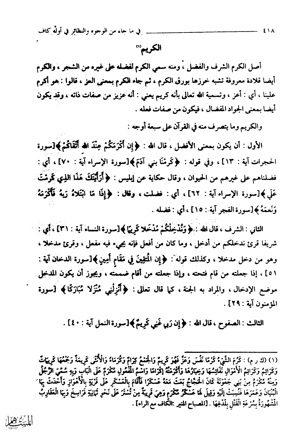 الأول: أن يكون بمعنى الأفضل، " قال اللَّه: (إِنَّ أَكْرَمَكُمْ عِنْدَ اللَّهِ أَتْقَاكُمْ) وفي قوله: (كَرَّمْنَا بَنِي آدَمَ) أي: فضلناهم على غيرهم من الحيوان، وقال حكاية عن إبليس: (أَرَأَيْتَكَ هَذَا الَّذِي كَرَّمْتَ عَلَيَّ) أي: فضلت، وقال: (إِذَا مَا ابْتَلَاهُ رَبُّهُ فَأَكْرَمَهُ وَنَعَّمَهُ) أي: فضله.