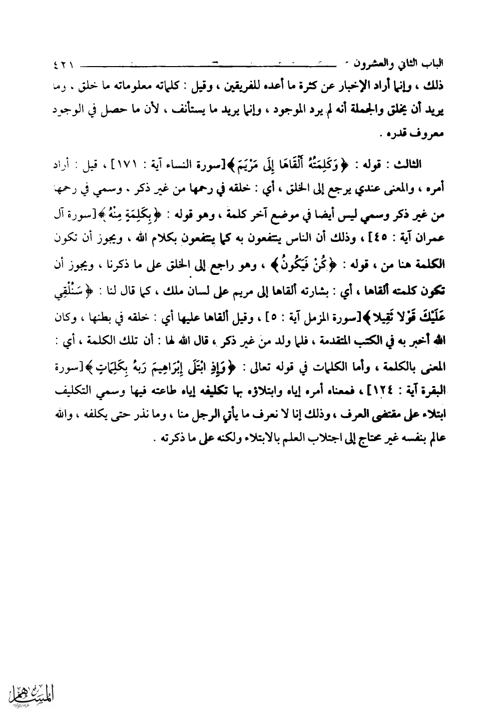 الثالث؛ قوله: (وَكَلِمَتُهُ أَلْقَاهَا إِلَى مَرْيَمَ) قيل أراد أمره، والمعنى عندى يرجع إلى الخلق، أي: خلقه في رحمها من غير ذكر، وسمي في رحمها من غير ذكر وسمي ليس أيضا في موضع آخر كلمة، وهو قوله: (بِكَلِمَةٍ مِنْهُ) وذلك أن الناس ينتفعون به كما ينتفعون بكلام الله، ويجوز أن تكون الكلمة هنا من، قوله: (كُنْ فَيَكونُ)، وهو راجع إلى الخلق على ما ذكرنا، ويجوز أن تكون كلمته ألقاها، أي: بشارته ألقاها إلى مريم على لسان ملك، كما قال لنا: (سَنُلْقِي عَلَيْكَ قَوْلًا ثَقِيلًا) وقيل ألقاها عليها أي: خلقه في بطنها، وكأنَّ الله أخبر به في الكتب المتقدمة، فلما ولد من غير ذكر، قال الله لها: إن تلك الكلمة، أي: المعنى بالكلمة، وأما الكلمات في قوله تعالى: (وَإِذِ ابْتَلَى إِبْرَاهِيمَ رَبُّهُ بِكَلِمَاتٍ) فمعناه أمره إياه وابتلاؤه بها تكليفه إياه طاعته فيها؛ سمي التكليف ابتلاء على مقتضى العرف، وذلك إنا لا نعرف ما يأتي الرجل منا، وما نذر حتى يكلفه، والله عالم بنفسه غير محتاج إلى اجتلاب العلم بالابتلاء ولكنه على ما ذكرته.
