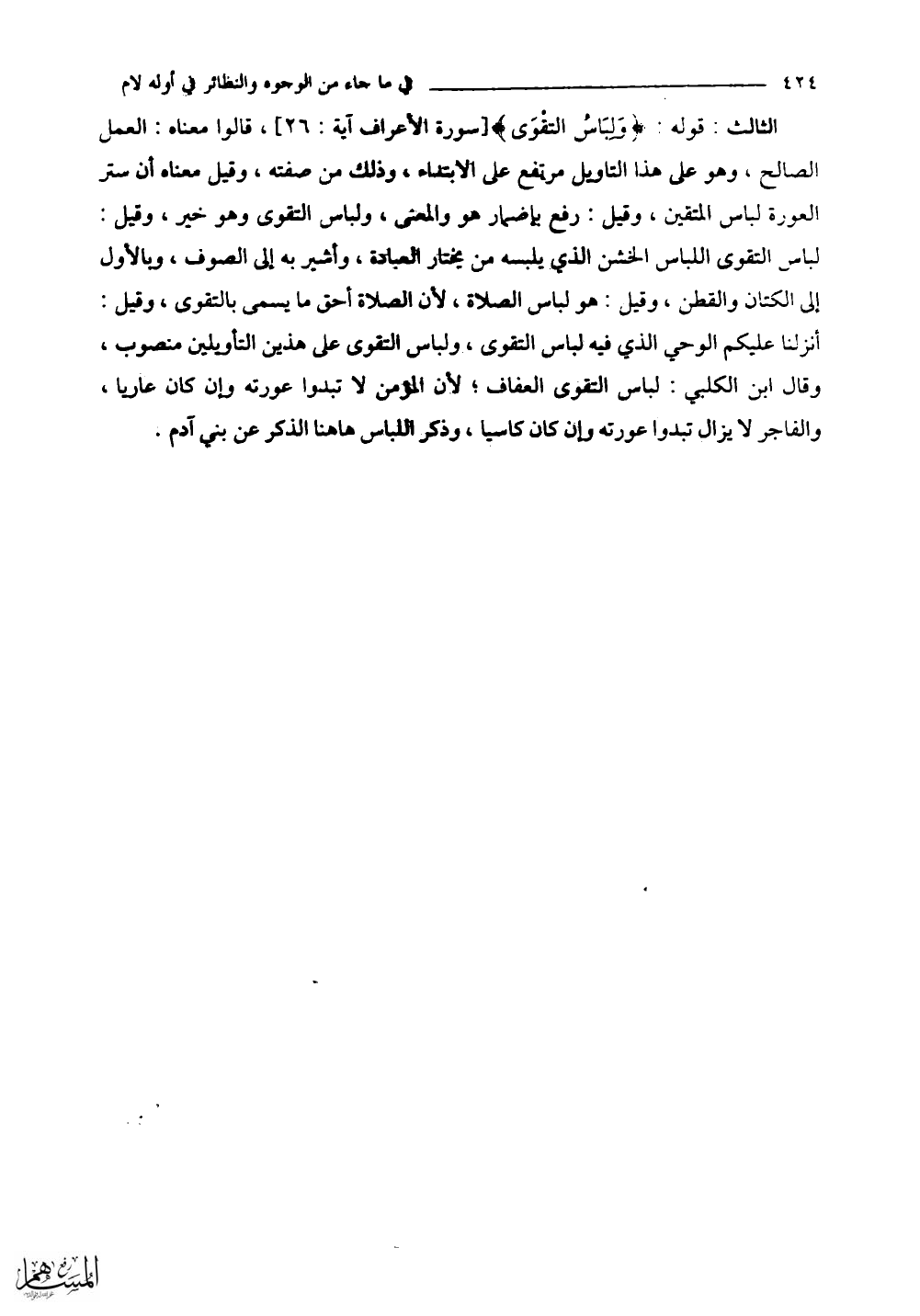 الثالث قوله: (وَلِبَاسُ التَّقْوَى) قالوا معناه: العمل الصالح، وهو على هذا التأويل مرتفع على الابتداء، وذلك من صفته، وقيل معناه أن ستر العورة: لباس المتقين، وقيل؛ رفع بإضمار هو والمعنى، ولباس التقوى وهو خير، وقِيل: لباس التقوى اللباس الخشن الذي يلبسه من يختار العبادة، وأشير به إلى الصوف، وبالأول إلى الكتان والقطن، وقيل: هو لباس الصلاة، لأن الصلاة أحق ما يسمى بالتقوى، وقيل: أنزلنا عليكم الوحي الذي فيه لباس التقوى، ولباس التقوى على هذين التأويلين منصوب، وقال ابن الكلبي: لباس التقوى العفاف؛ لأن المؤمن لا تبدوا عورته وإن كان عاريا، والفاجر لا يزال تبدوا عورته وإن كان كاسيا، وذكر اللباس هاهنا الذكر عن بني آدم.