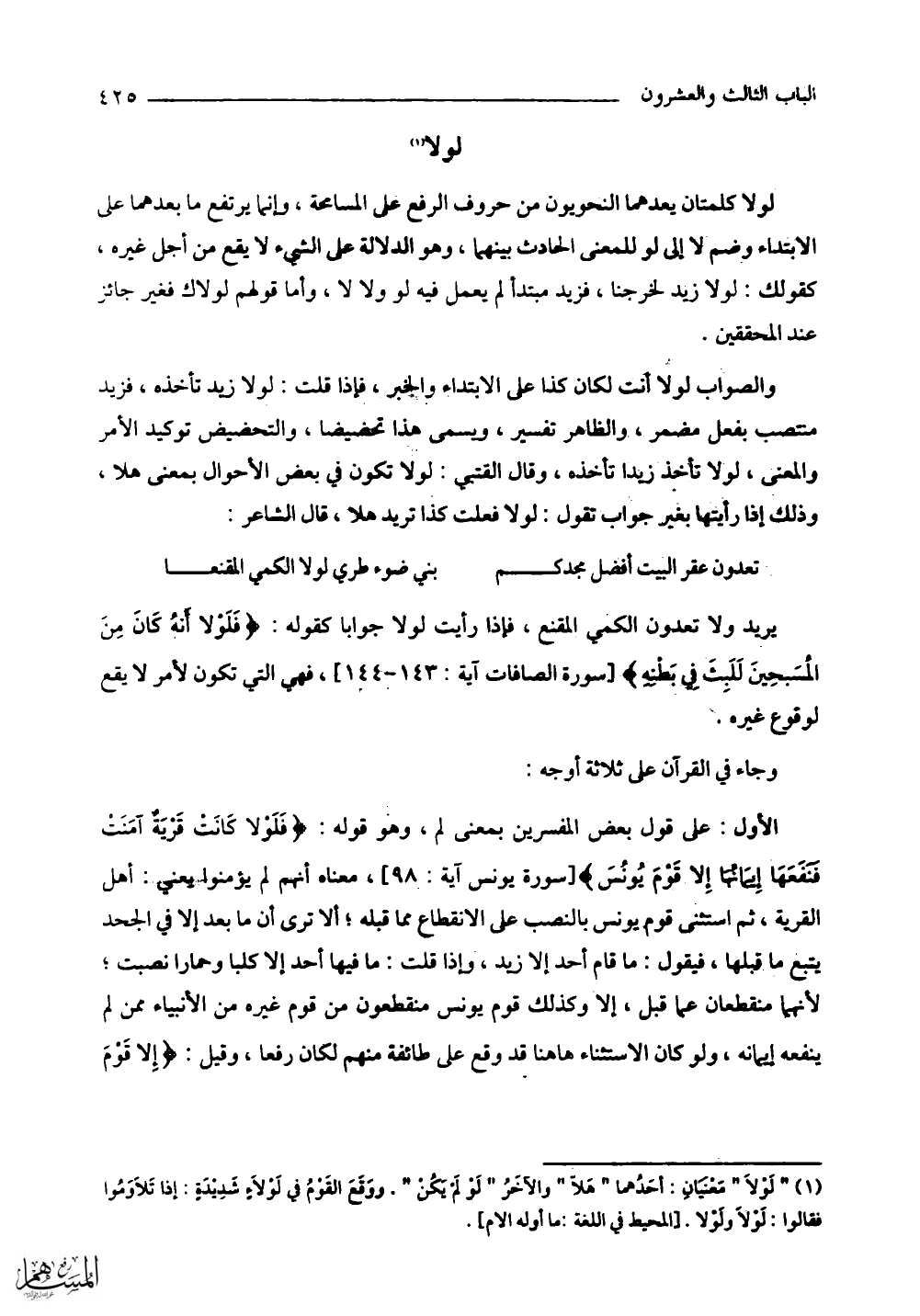 الأول: على قول بعض المفسرين بمعنى لم، وهو قوله: (فَلَوْلَا كَانَتْ قَرْيَةٌ آمَنَتْ فَنَفَعَهَا إِيمَانُهَا إِلَّا قَوْمَ يُونُسَ) معناه أنهم لم يؤمنوا يعني: أهل القرية، ثم استشنى قوم يونس بالنصب على الانقطاع مما قبله؛ ألا ترى أن ما بعد إلا في الجحد يتبع ما قبلها، فيقول: ما قام أحد إلا زيد، وإذا قلت: ما فيها أحد إلا كلبا وحمارا نصبت؛ لأنهما منقطعان عما قبل، إلا وكذلك قوم يونس منقطعون من قوم غيره من الأنبياء ممن لم ينفعه إيمانه، ولو كان الاستثناء هاهنا قد وقع على طائفة منهم لكان رفعا، وقيل: (إِلا قومَ