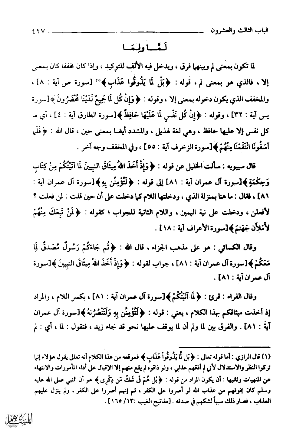 لَمَّا تكون بمعنى لم وبينهما فرق، ويدخل فيه الألف للتوكيد، وإذا كان مخففا كان بمعنى إلا، فالذي هو بمعنى لم، قوله: (بَلْ لَمَّا يَذُوقُوا عَذَابِ) والمخفف الذي يكون دخوله بمعنى إلا، وقوله: (وَإِنْ كُلٌّ لَمَّا جَمِيعٌ لَدَيْنَا مُحْضَرُونَ) وقوله: (إِنْ كُلُّ نَفْسٍ لَمَّا عَلَيْهَا حَافِظٌ) أي ما كل نفس إلا عليها حافظ، وهي لغة لهذيل، والمشدد أيضا بمعنى حين، قال الله: (فَلَمَّا آسَفُونَا انْتَقَمْنَا مِنْهُمْ) وفي المخفف وجه آخر.