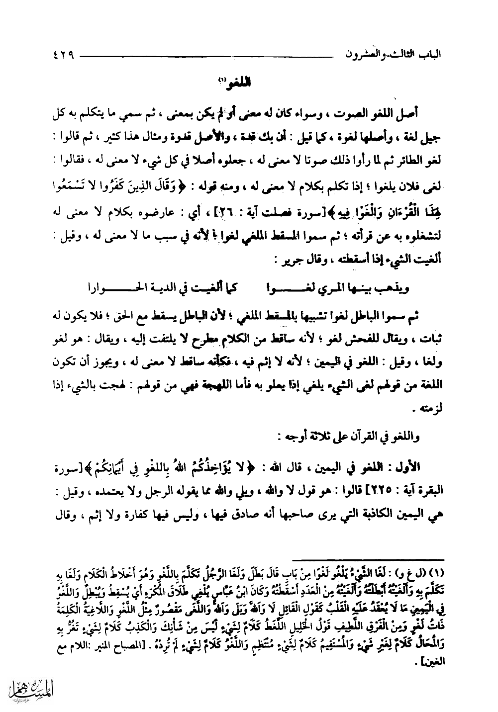 ثم سموا الباطل لغوا تشبيها بالمسقط الملغي؛ لأن الباطل يسقط مع الحق؛ فلا يكون له ثبات، ويقال للفحش لغو؛ لأنه ساقط من الكلام مطرح لا يلتفت إليه، ويقال: هو لغو ولغا، وقيل: اللغو في اليمين؛ لأنه لا إثم فيه، فكأنه ساقط لا معنى له، ويجوز أن تكون اللغة من قولهم لغى الشيء يلغي إذا يعلو به فأمَّا اللهجة فهي من قولهم: لهجت بالشيء إذا لزمته.
