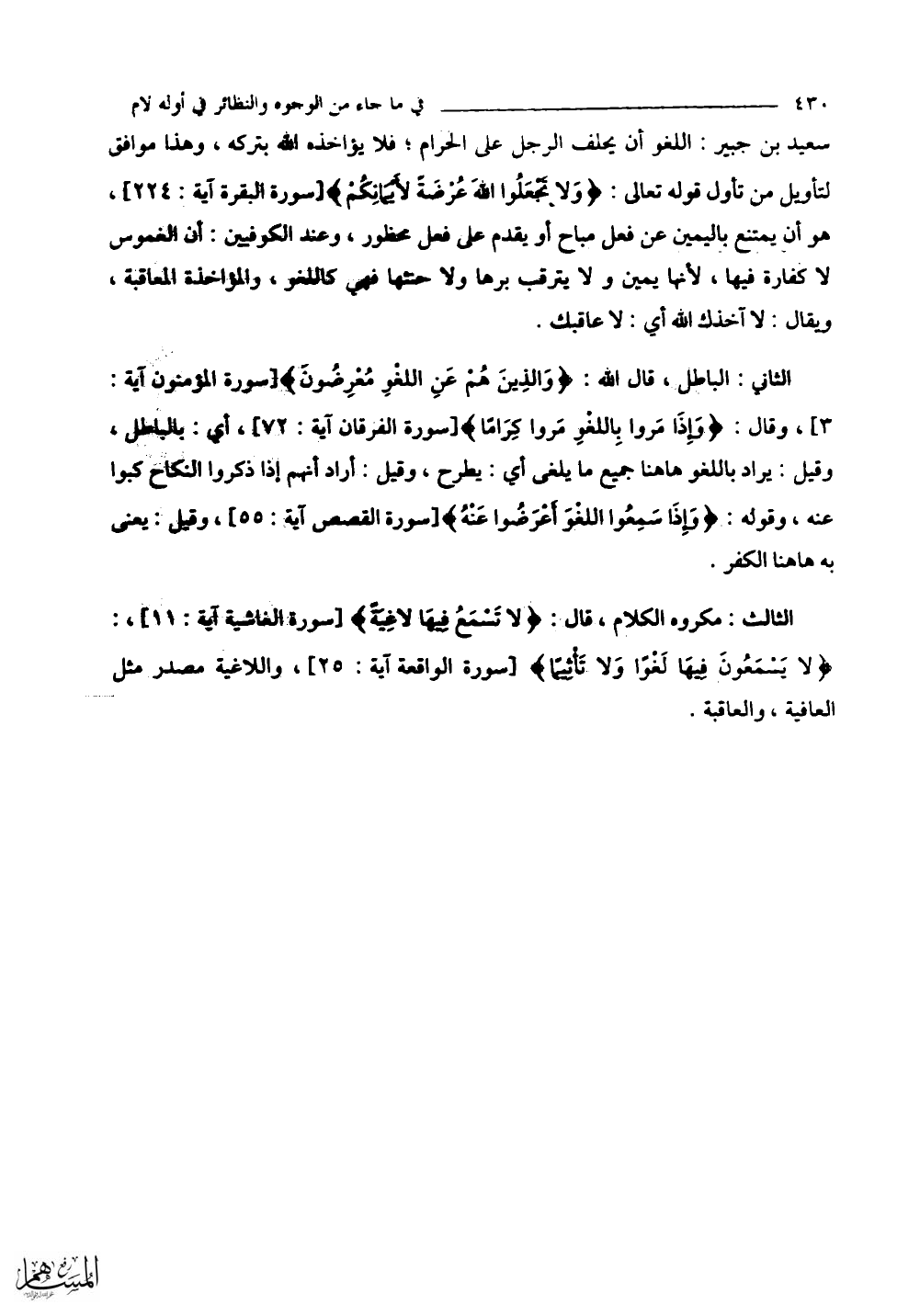 الثاني: الباطل، قال اللَّه: (وَالَّذِينَ هُمْ عَنِ اللَّغْوِ مُعْرِضُونَ) وقال: (وَإِذَا مَرُّوا بِاللَّغْوِ مَرُّوا كِرَامًا) أي: بالباطل. وقيل: يراد باللغو هاهنا جميع ما يلغى أي: يطرح، وقيل: أراد أنهم إذا ذكروا النكاح كبوا عنه، وقوله: (وَإِذَا سَمِعُوا اللَّغْوَ أَعْرَضُوا عَنْهُ) وقِيل: يعني به هاهنا الكفر.