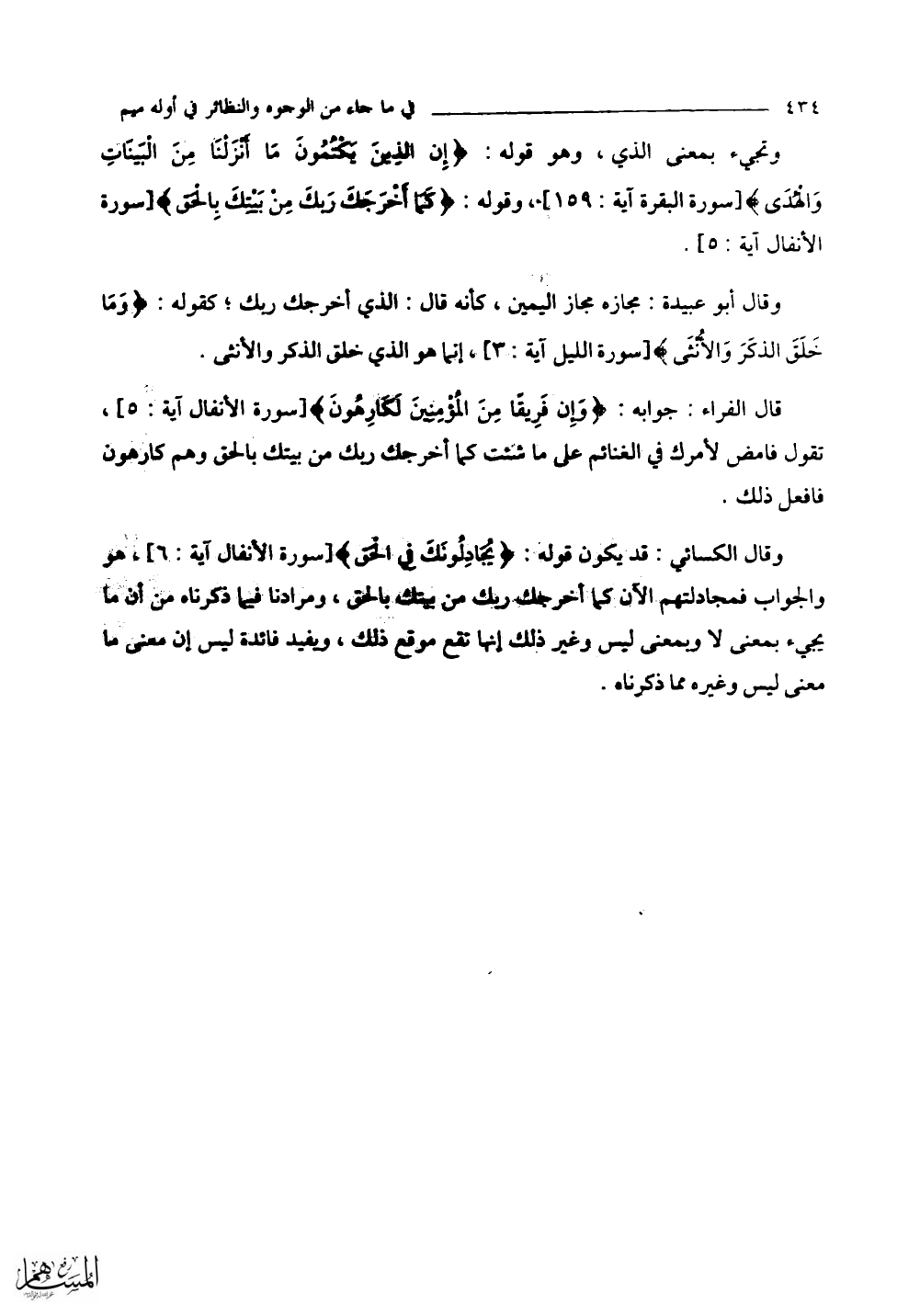 وقال الكسائي: قد يكون قوله: (يُجَادِلُونَكَ فِي الْحَقِّ) هو والجواب فمجادلتهم الآن كما أخرجك ربك من بيتك بالحق، ومرادنا فيما ذكرناه من أن ما يجيء بمعنى لا وبمعنى ليس وغير ذلك إنها تقع موقع ذلك، ويفيد فائدة ليس إن معنى ما معنى ليس وغيره مما ذكرناه.