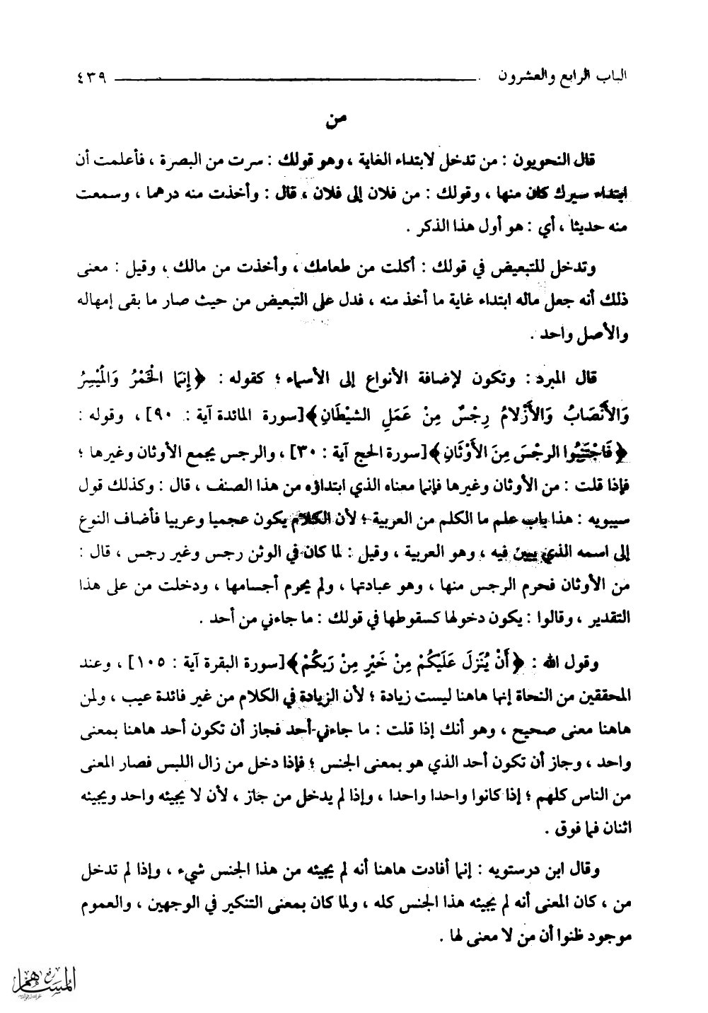 قال المبرد: وتكون لإضافة الأنواع إلى الأسماء؛ كقوله: (إِنَّمَا الْخَمْرُ وَالْمَيْسِرُ وَالْأَنْصَابُ وَالْأَزْلَامُ رِجْسٌ مِنْ عَمَلِ الشَّيْطَانِ) وقوله: (فَاجْتَنِبُوا الرِّجْسَ مِنَ الْأَوْثَانِ) والرجس يجمع الأوثان وغيرها؛ فإذا قلت: من الأوثان وغيرها فإنما معناه الذي ابتداوه من هذا الصنف، قال: وكذلك قول سيبويه: هذا ياب علم ما الكلم من العربية؛ لأن الكلام يكون عجميا وعربيا فأضاف النوع إلى اسمه الذي يبين فيه، وهو العربية، وقيل: لما كان في الوثن رجس وغير رجس، قال: من الأوثان فحرم الرجس منها، وهو عبادتها، ولم يحرم أجسامها، ودخلت (مِن) على هذا التقدير، وقالوا: يكون دخولها كسقوطها في قولك: ما جاءني من أحد.