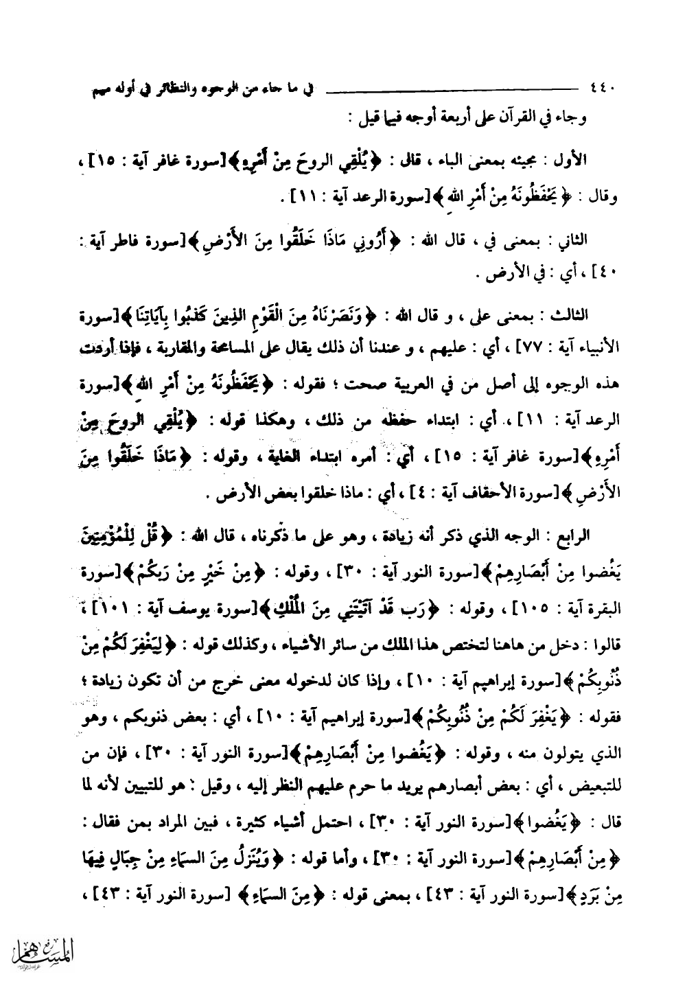 الثالث: بمعنى على، وقال اللَّه: (وَنَصَرْنَاهُ مِنَ الْقَوْمِ الَّذِينَ كَذَّبُوا بِآيَاتِنَا) أي: عليهم، وعندنا أن ذلك يقال على المسامحة والمقاربة، فإذا أردت هذه الوجوه إلى أصل من في العربية صحت؛ فقوله: (يَحْفَظُونَهُ مِنْ أَمْرِ اللَّهِ) أي: ابتداء الغاية من ذلك، وهكذا قوله: (يُلْقِي الرُّوحَ مِنْ أَمْرِهِ) أي: أمره ابتداء الغاية، وقوله: (مَاذَا خَلَقُوا مِنَ الْأَرْضِ) أي: ماذا خلقوا بعض الارض.
