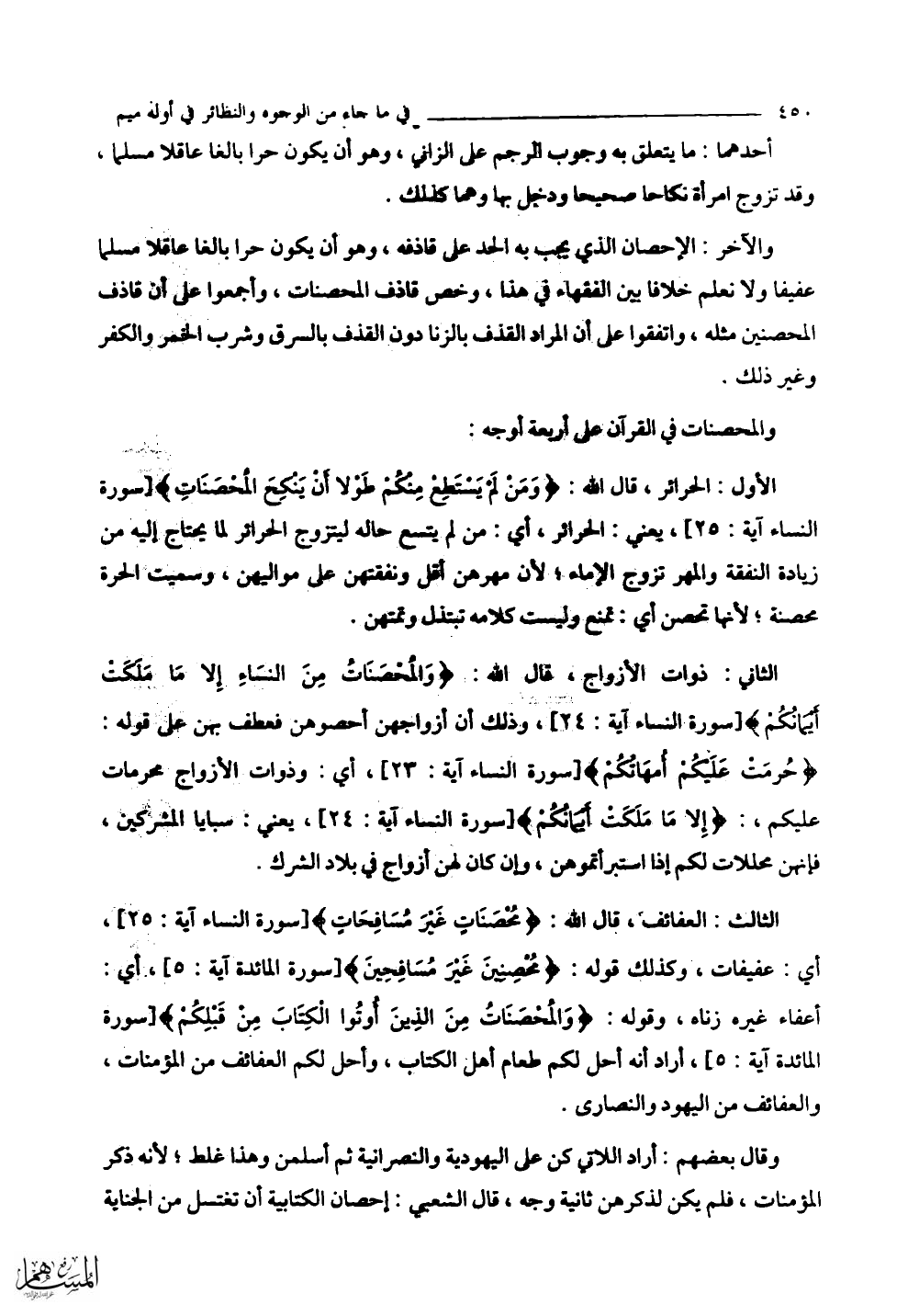 الثاني: ذوات الأزواج، قال اللَّه: (وَالْمُحْصَنَاتُ مِنَ النِّسَاءِ إِلَّا مَا مَلَكَتْ أَيْمَانُكُمْ) وذلك أن أزواجهن أحصنوهن فعطف بهن على قوله: (حُرِّمَتْ عَلَيْكُمْ أُمَّهَاتُكُمْ) أي: وذوات الأزواج محرمات عليكم،: إِلَّا مَا مَلَكَتْ أَيْمَانُكُمْ) يعني: سبايا المشركين، فإنهن محللات لكم إذا استبرأتموهن، وإن كان لهن أزواج في بلاد الشرك. الثالث: العفائف، تجال اللَّه: (مُحْصَنَاتٍ غَيْرَ مُسَافِحَاتٍ) أي: عفيفات، وكذلك قوله: (مُحْصِنِينَ غَيْرَ مُسَافِحِينَ) أي: أعفاء غير زناة، وقوله: (وَالْمُحْصَنَاتُ مِنَ الَّذِينَ أُوتُوا الْكِتَابَ مِنْ قَبْلِكُمْ) أراد أنه أحل لكم طعام أهل الكتاب، وأحل لكم العفائف من المؤمنات، والعفائف من اليهود والنصارى.