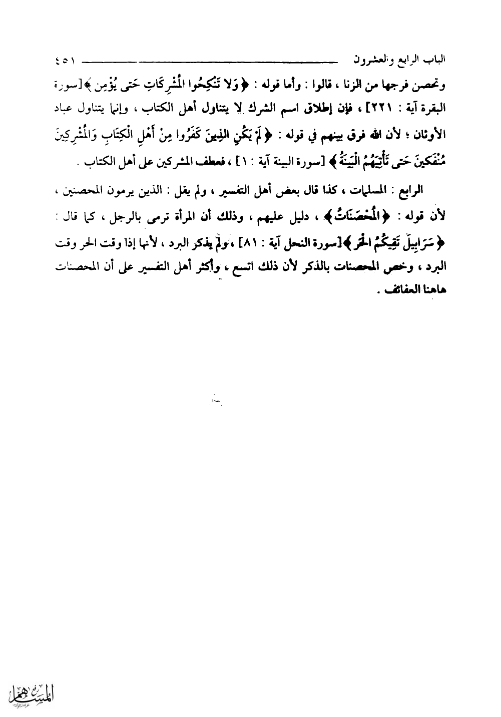 وتحصن فرجها من الزنا، قالوا: وأما قوله: (وَلَا تَنْكِحُوا الْمُشْرِكَاتِ حَتَّى يُؤْمِنَّ)؛ فإن إطلاق اسم الشرك لا يتاول أهل الكتاب، وإنما يتناول عُبَّاد الأوثان؛ لأن الله فرق بينهم في قوله: (لَمْ يَكُنِ الَّذِينَ كَفَرُوا مِنْ أَهْلِ الْكِتَابِ وَالْمُشْرِكِينَ مُنْفَكِّينَ حَتَّى تَأْتِيَهُمُ الْبَيِّنَةُ) فعطف المشركين على أهل الكتاب.