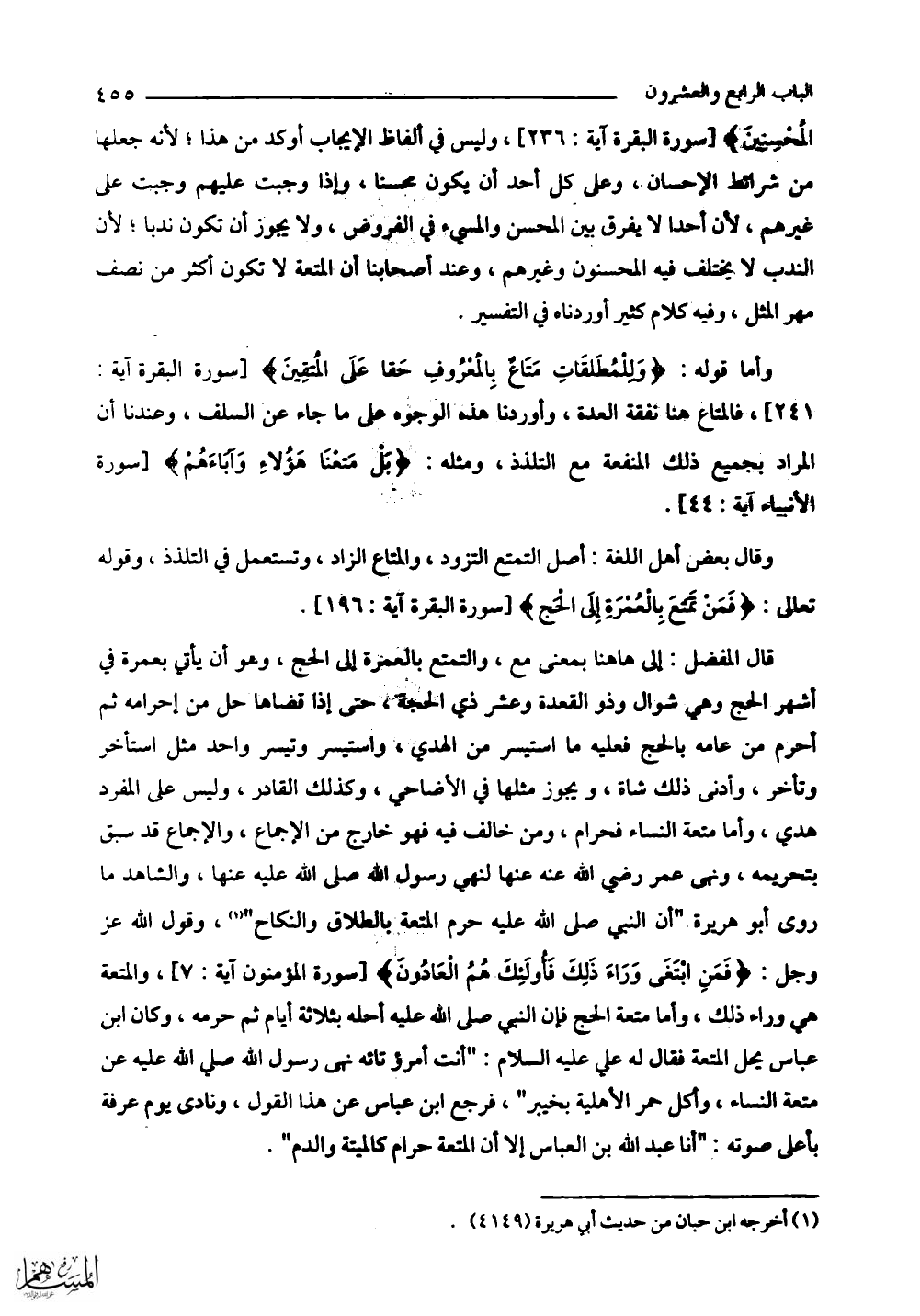 قال المفضل: إلى هاهنا بمعنى مع، والتمتع بالعمرة إلى الحج، وهو أن يأتي بعمرة في أشهر الحج وهي شوال وذو القعدة وعشر ذي الحجة، حى إذا قضاها حل من إحرامه ثم أحرم من عامه بالحج فعليه ما استيسر من الهَدْي، واستيسر وتيسر واحد مثل استأخر وتأخر، وأدنى ذلك شاة، ويجوز مثلها في الأضاحي، وكذلك القادر، وليس على المفرد هدْي، وأما متعة النساء فحرام، ومن خالف فيه فهو خارج من الإجماع، والإجماع قد سبق بتحريمه، ونهى عمر - رضي الله عنه - عنها لنهي رسول اللَّه - صلى الله عليه وسلم - عنها، والشاهد ما روى أبو هريرة أن النبي - صلى الله عليه وسلم - حرم المتعة بالِطلاق والنكاحِ "، وقول الله عز وجل: (فَمَنِ ابْتَغَى وَرَاءَ ذَلِكَ فَأُولَئِكَ هُمُ الْعَادُونَ) والمتعة هي وراء ذلك، وأما متعة الحج فإن النبي - صلى الله عليه وسلم - أحله بثلاثة أيام ثم حرمه، وكان ابن عباس يحل المتعة فقال له علي - عليه السلام - " أنت امرؤ تائه نهى رسول الله - صلى الله عليه وسلم - عن متعة النساء، وأكل حمر الأهلية بخيبر "، فرجع ابن عبَّاس عن هذا القول، ونادى يوم عرفة بأعلى صوته: " أنا عبد الله بن العباس ألا إن المتعة حرام كالميتة والدم ".