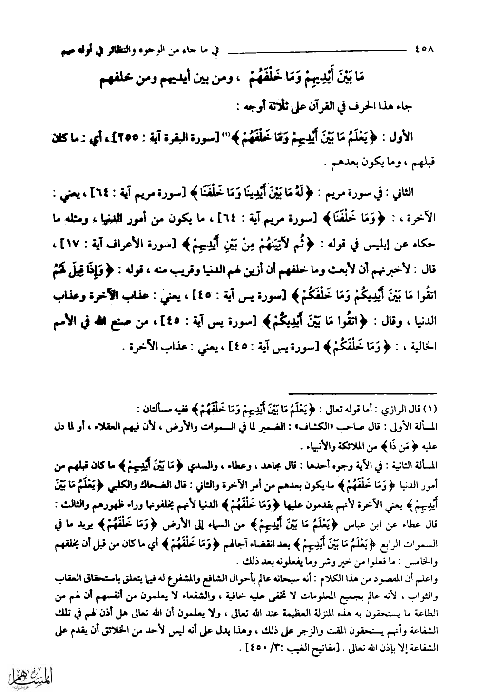(مَا بَيْنَ أَيْدِيهِمْ وَمَا خَلْفَهُمْ)، و (مِنْ بَيْنِ أَيْدِيهِمْ وَمِنْ خَلْفِهِمْ)