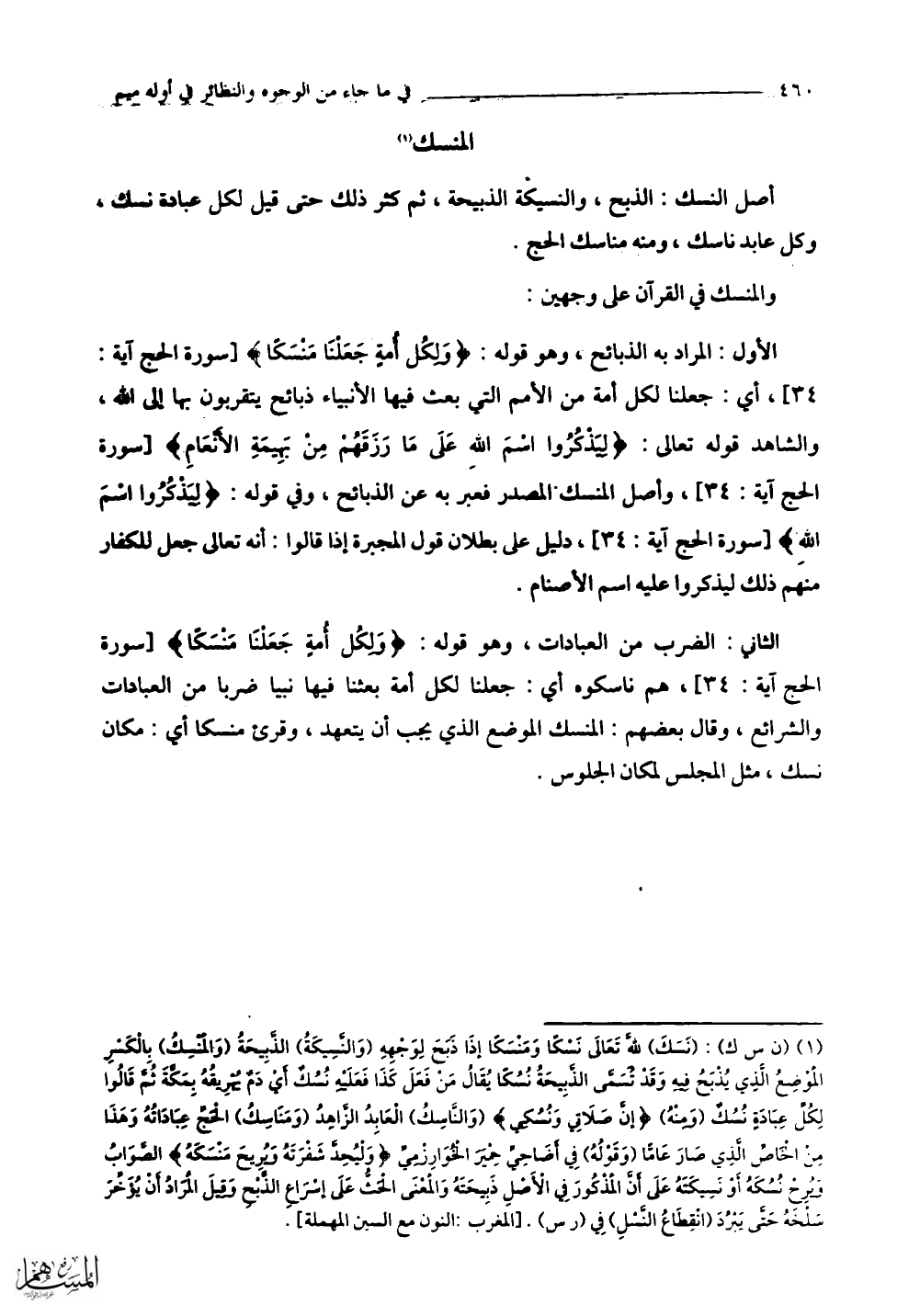 الأول؛ المراد به الذبائح، وهو قوله: (وَلِكُلِّ أُمَّةٍ جَعَلْنَا مَنْسَكًا) أي: جعلنا لكل أمة من الأمم التي بعث فيها الأنبياء ذبائح يتقربون بها إلى الله، والشاهد قوله تعالى: (لِيَذْكُرُوا اسْمَ اللَّهِ عَلَى مَا رَزَقَهُمْ مِنْ بَهِيمَةِ الْأَنْعَامِ) وأصل المنسك المصدر فعبر به عن الذبائح، وفي قوله: (لِيَذْكُرُوا اسْمَ اللَّهِ) دليل على بطلان قول المجبرة إذ قالوا: إنه تعالى جعل للكفار منهم ذلك ليذكروا عليه اسم الأصنام.