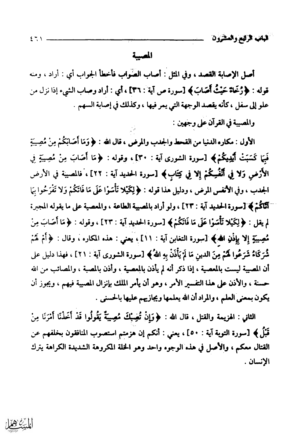 الأول: مكاره الدنيا من القحط والجدب والمرض، قال اللَّه: (وَمَا أَصَابَكُمْ مِنْ مُصِيبَةٍ فَبِمَا كَسَبَتْ أَيْدِيكُمْ) وقوله: (مَا أَصَابَ مِنْ مُصِيبَةٍ فِي الْأَرْضِ وَلَا فِي أَنْفُسِكُمْ إِلَّا فِي كِتَابٍ) فالمصيبة في الأرض الجدب، وفي الأنفس المرض، ودليل هذا قوله: (لِكَيْلَا تَأْسَوْا عَلَى مَا فَاتَكُمْ وَلَا تَفْرَحُوا بِمَا آتَاكُمْ) ولو أراد بالمصيبة الطاعة، والمعصية على ما يقوله المجبرة لم يقل: (لِكَيْلَا تَأْسَوْا عَلَى مَا فَاتَكُمْ) وقوله: (مَا أَصَابَ مِنْ مُصِيبَةٍ إِلَّا بِإِذْنِ اللَّهِ) يعنى: هذه المكاره؛ وقال: (أَمْ لَهُمْ شُرَكَاءُ شَرَعُوا لَهُمْ مِنَ الدِّينِ مَا لَمْ يَأْذَنْ بِهِ اللَّهُ)، فهذا دليل على أن المصبية ليست بالمعصية، إذ ذكر أنه لم يأذن بالمعصية، وأذن بالمصيبة، والمصائب من الله حسنة، والإذن على هذا التفسير الأمر، وهو أن يأمر الملك بإنزال المصيبة فيهم، ويجوز أن يكون بمعنى العلم، والمراد أن اللَّه يعلمها ويجازيهم عليها بالحسنى.