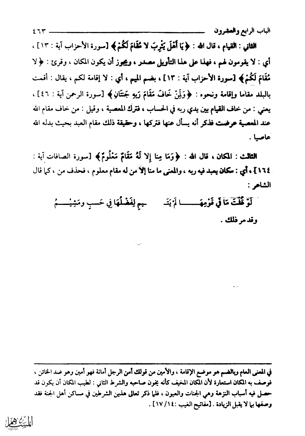 الثاني: القيام، قال الله: (يَا أَهْلَ يَثْرِبَ لَا مُقَامَ لَكُمْ) أي: لا يقومون لهم، فهذا كل هذا التأويل مصدر، ويجوز أن يكون المكان، وقرئ: (لا مُقَامَ لَكم) بضم الميم، أي: لا إقامة لكم، يقال: أقمت بالبلد مقاما وإقامة ونحوه: (وَلِمَنْ خَافَ مَقَامَ رَبِّهِ جَنَّتَانِ) يعني: من خاف القيام بين يدي ربه في الحساب، فترك المعصية، وقيل: من خاف مقام اللَّه عند المعصية عرضت فذكر أنه يسأل عنها فتركها، وحقيقة ذلك مقام العبد بحيث بدله الله عاصيا.