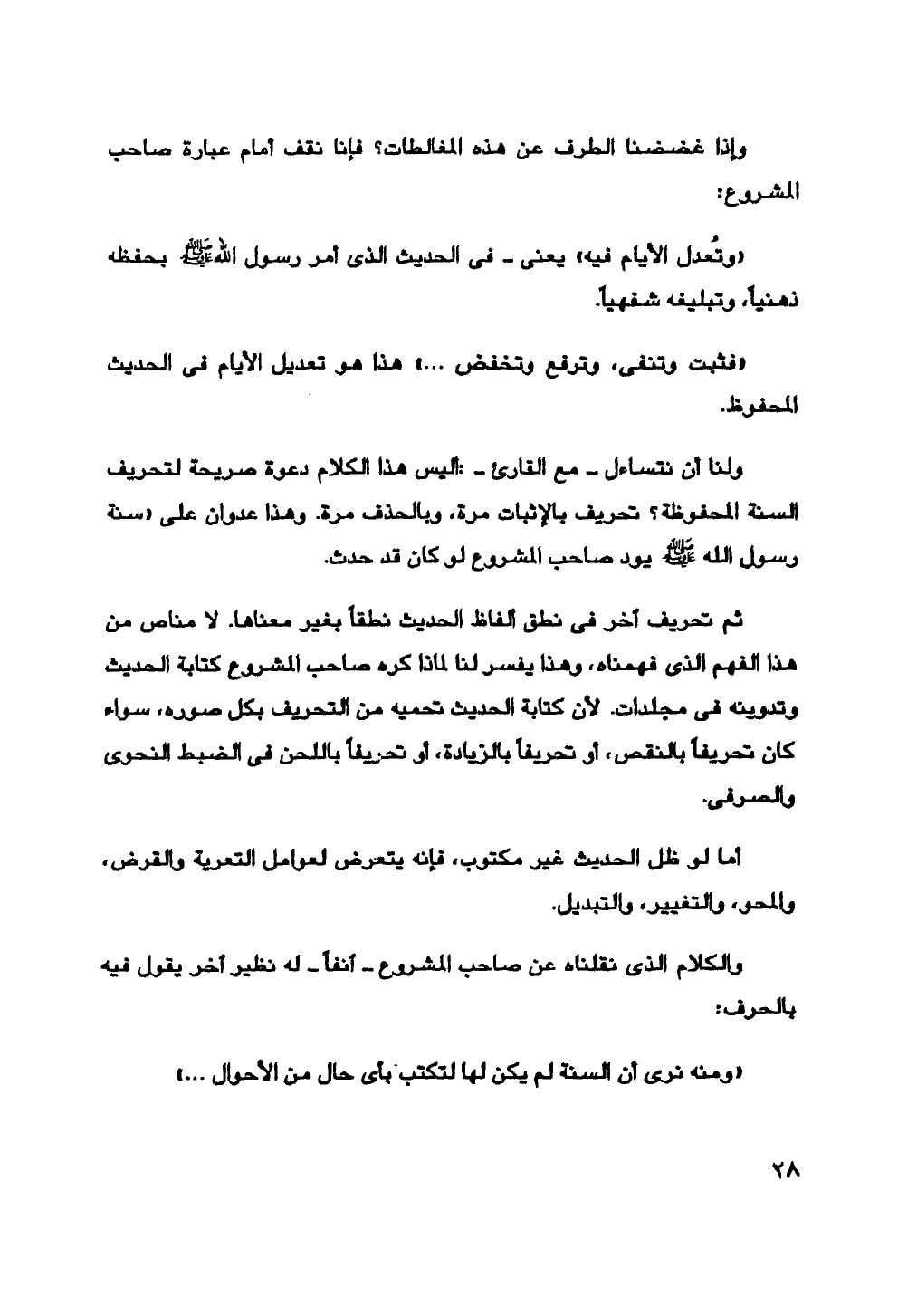 ثم تحريف أخر في نطق الفاظ الحديث نطقاً بغير معناها. لا مناص من هذا الفهم الذي فهمناه، وهذا يفسر لنا لماذا كره صاحب المشروع كتابة الحديث وتدوينه في مجلدات، لأن كتابة الحديث تحميه من التحريف بكل صوره، سواء ان تحريفاً بالنقص، أو تحريفاً بالزيادة، أو تحريفاً باللحن في الضبط النحوي والصرفي.