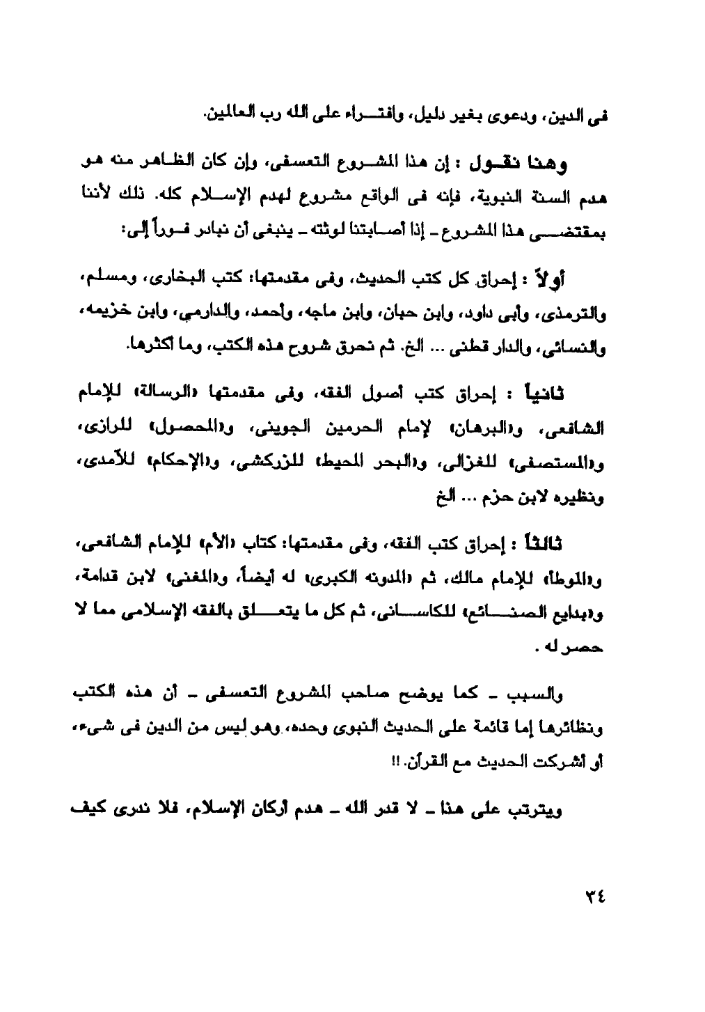 وهنا نقول: إن هذا المشروع التعسفي، وإن كان الظاهر منه هو هدم السنة النبوية، فإنه في الواقع مشروع لهدم الإسلام كله. ذلك لأننا بمقتضى هذا المشروع - إذا أصابتنا لوثته - ينبغي أن نبادر فوراُ إلى: