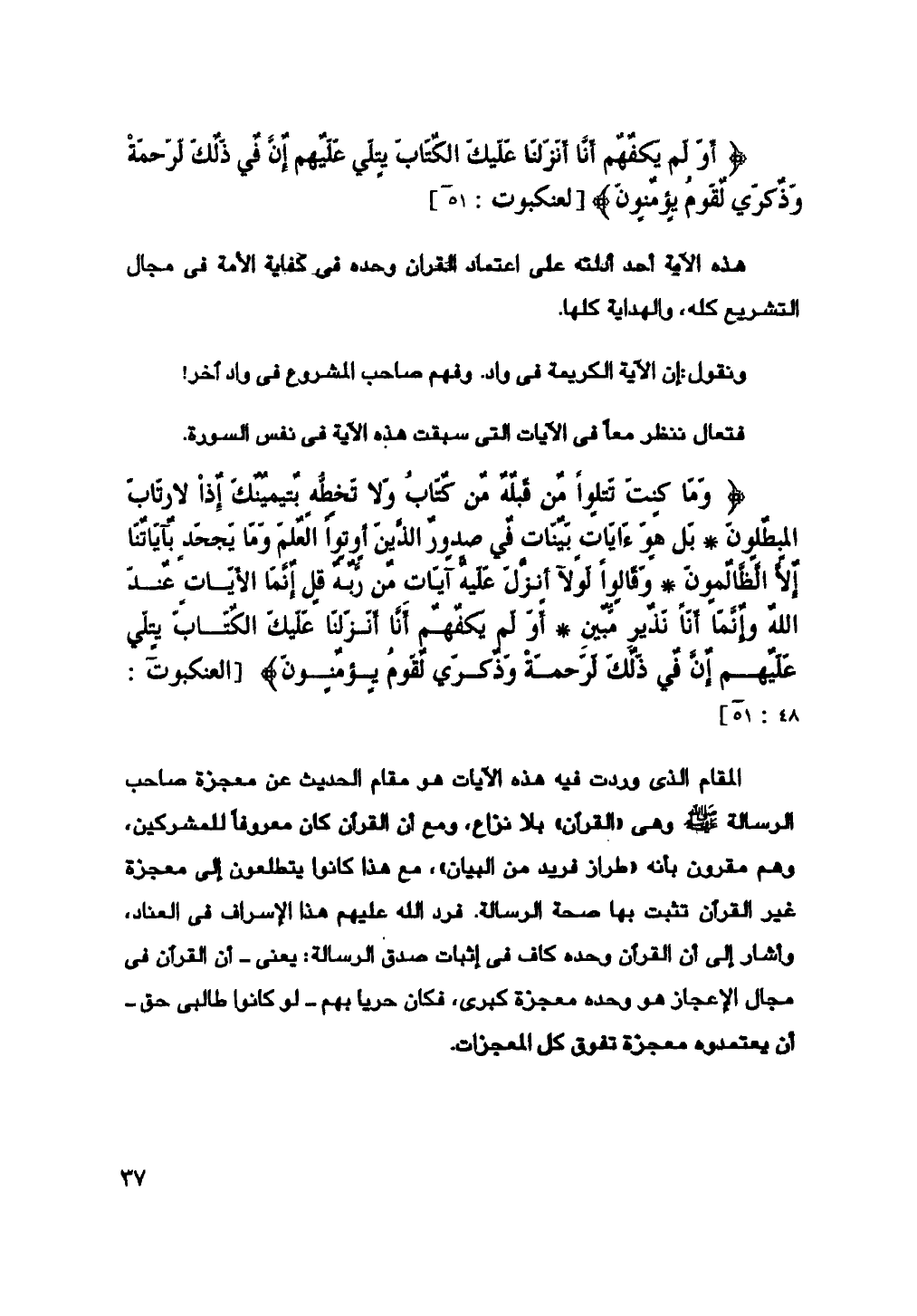 {وَمَا كُنْتَ تَتْلُو مِنْ قَبْلِهِ مِنْ كِتَابٍ وَلَا تَخُطُّهُ بِيَمِينِكَ إِذًا لَارْتَابَ الْمُبْطِلُونَ (48) بَلْ هُوَ آيَاتٌ بَيِّنَاتٌ فِي صُدُورِ الَّذِينَ أُوتُوا الْعِلْمَ وَمَا يَجْحَدُ بِآيَاتِنَا إِلَّا الظَّالِمُونَ (49) وَقَالُوا لَوْلَا أُنْزِلَ عَلَيْهِ آيَاتٌ مِنْ رَبِّهِ قُلْ إِنَّمَا الْآيَاتُ عِنْدَ اللَّهِ وَإِنَّمَا أَنَا نَذِيرٌ مُبِينٌ (50) أَوَلَمْ يَكْفِهِمْ أَنَّا أَنْزَلْنَا عَلَيْكَ الْكِتَابَ يُتْلَى عَلَيْهِمْ إِنَّ فِي ذَلِكَ لَرَحْمَةً وَذِكْرَى لِقَوْمٍ يُؤْمِنُونَ} [العنكبوت: 48: 51]