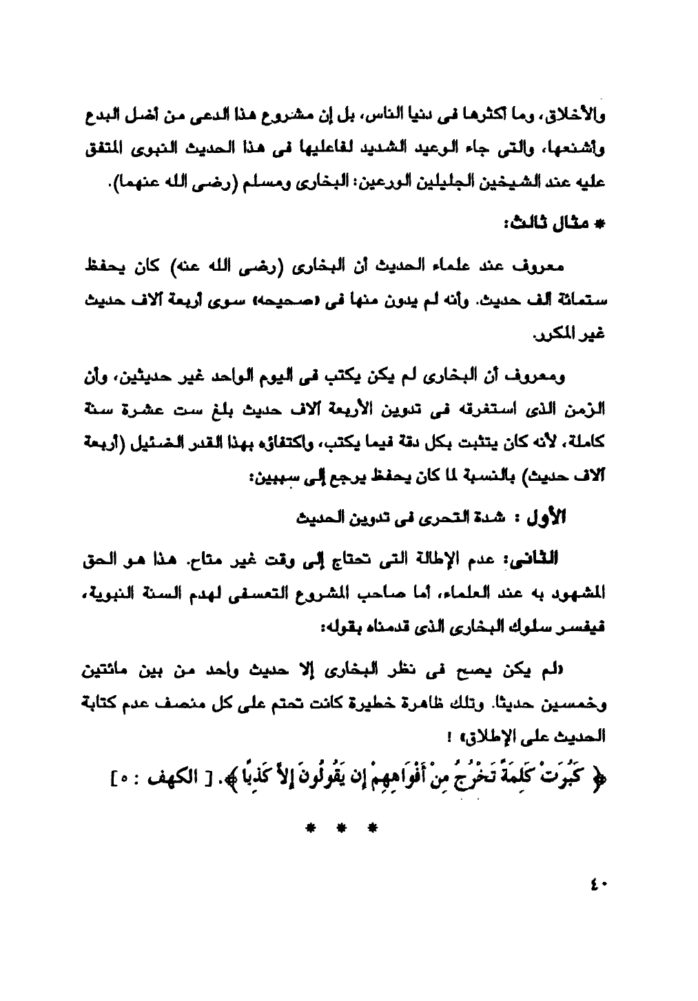 "لم يكن يصح في نظر البخاري إلا حديث واحد من بين مائتين وخمسين حديثاً. وتلك ظاهرة خطيرة كانت تحتم على كل منصف عدم كتابة الحديث على الإطلاق"!