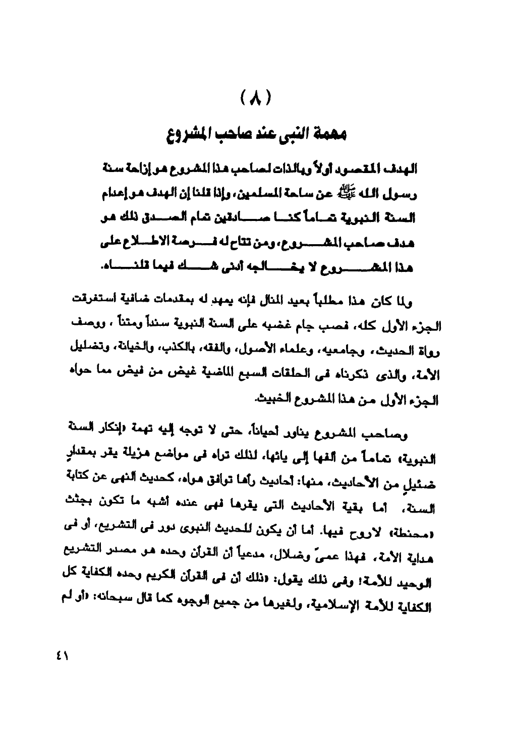 ولما كان هذا مطلباً بعيد المنال فإنه يمهد له بمقدمات ضافية استغرقت الجزء الأول كله، فصب جام غضبه على السنة النبوية سنداً ومتناً، ووصف روأة الحديث، وجامعية، وعلماء الأصول، والفقه، بالكذب، والخيانة" وتضليل الأمة، والذي ذكرناه في الحلقات السبع الماضية غيض من فيض مما حواه الجزء الأول من هذا المشروع الخبيث.