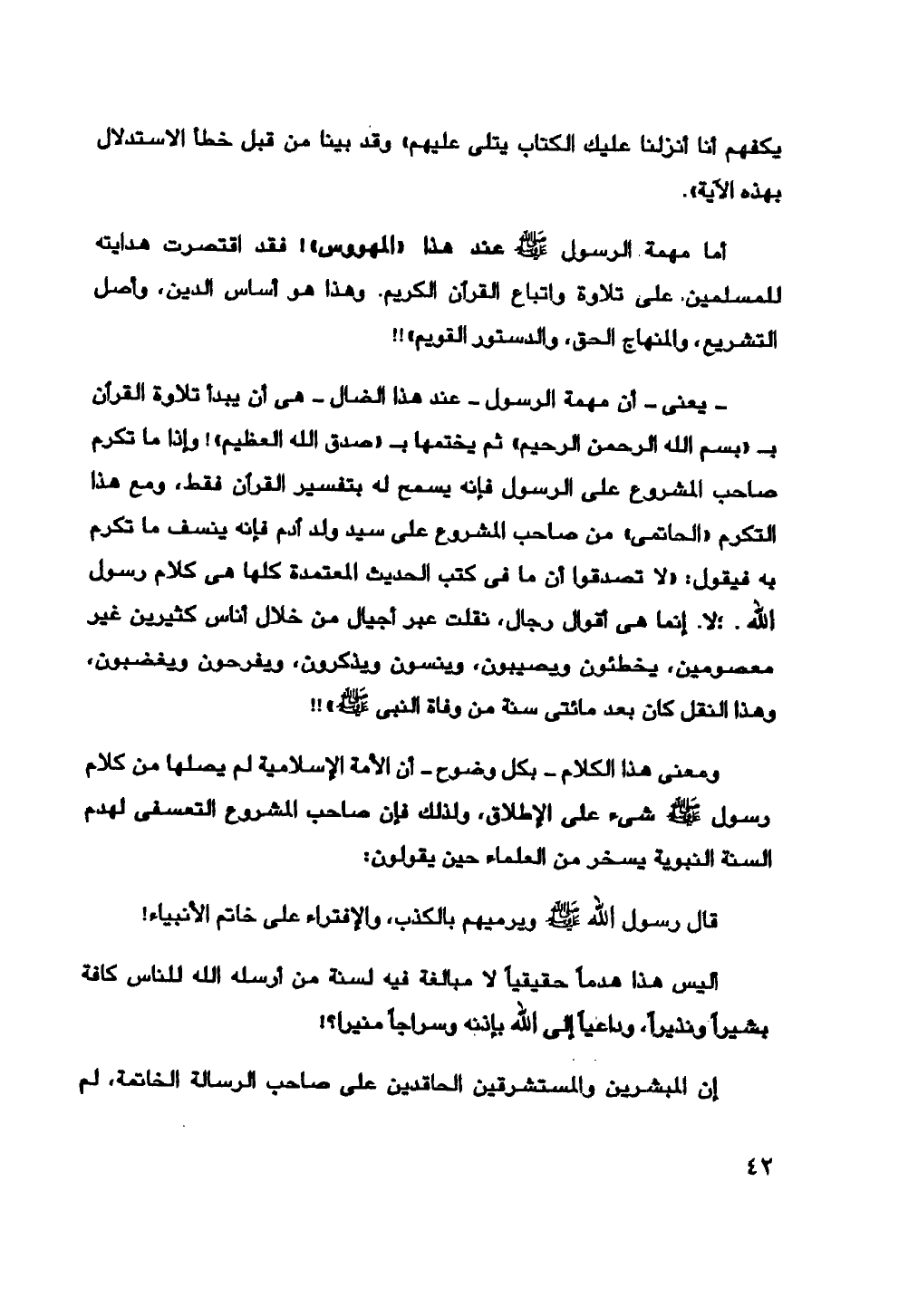 أما مهمة الرسول - صلى الله عليه وسلم - عند خذا "المهووس"! فقد اقتصرت هدايته للمسلمين، على تلاوة واتباع القرآن الكريم. وهذا هو أساس الدسن، وأصل التشريع، والمنهاج الحق، والدستور القويم"!!
