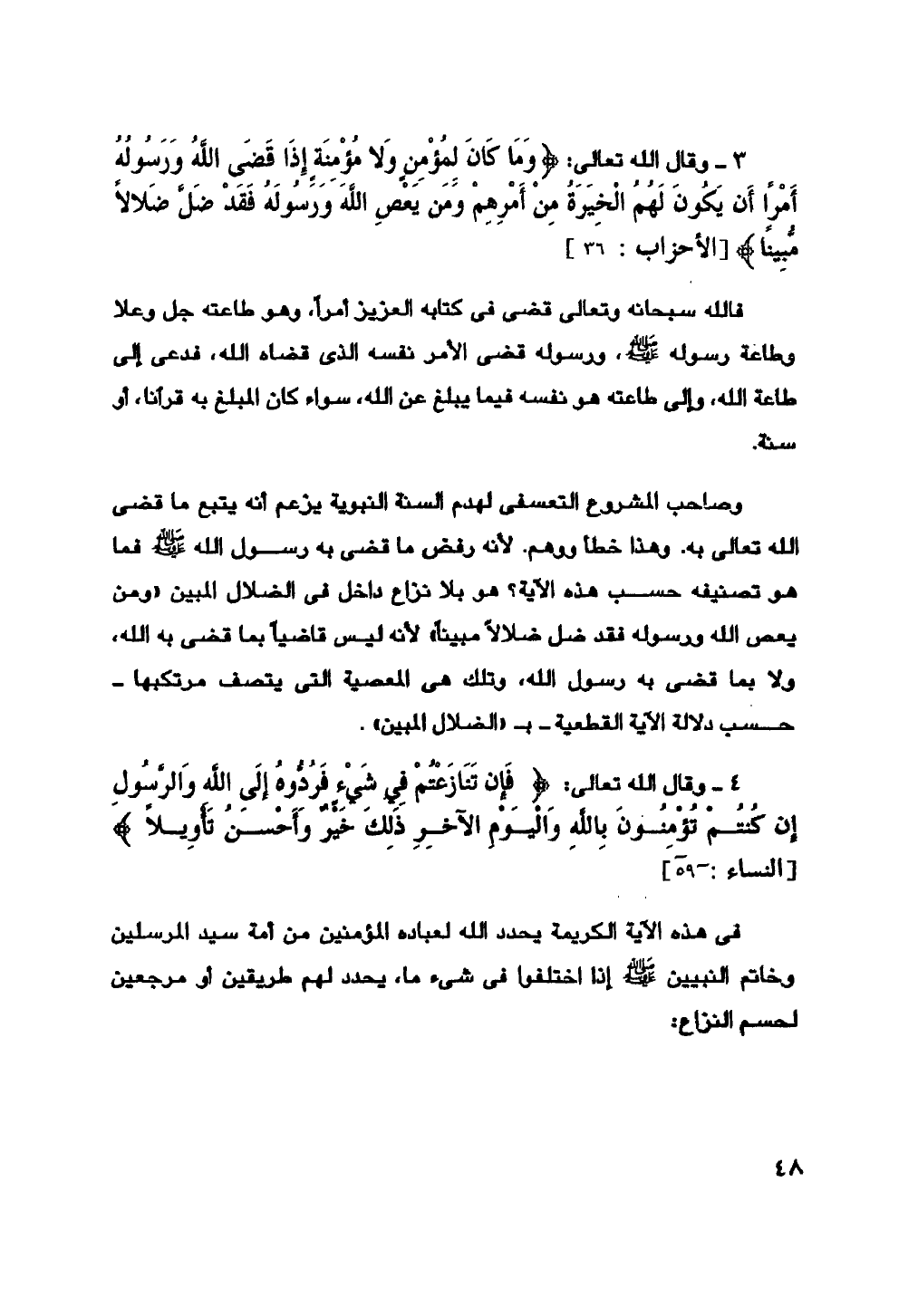 وصاحب المشروع التعسفي لهدم السنة النبوية يزعم أنه يتبع ما قضي الله تعالى به. وهذا خطأ ووهم. لأنه رفض ما قضي به رسول الله - صلى الله عليه وسلم - فما هو تصنيفه حسب هذه الآية؟ هو بلا نزاع داخل في الضلال المبين {وَمَنْ يَعْصِ اللَّهَ وَرَسُولَهُ فَقَدْ ضَلَّ ضَلَالًا مُبِينًا} لأنه ليس قاضياً بما قضى به الله، ولا بما قضى به رسول الله، وتلك هي المعصية التي يتصف مرتكبها - حسب دلالة الآية القطعية - بـ "الضلال المبين".